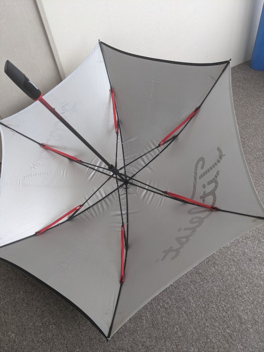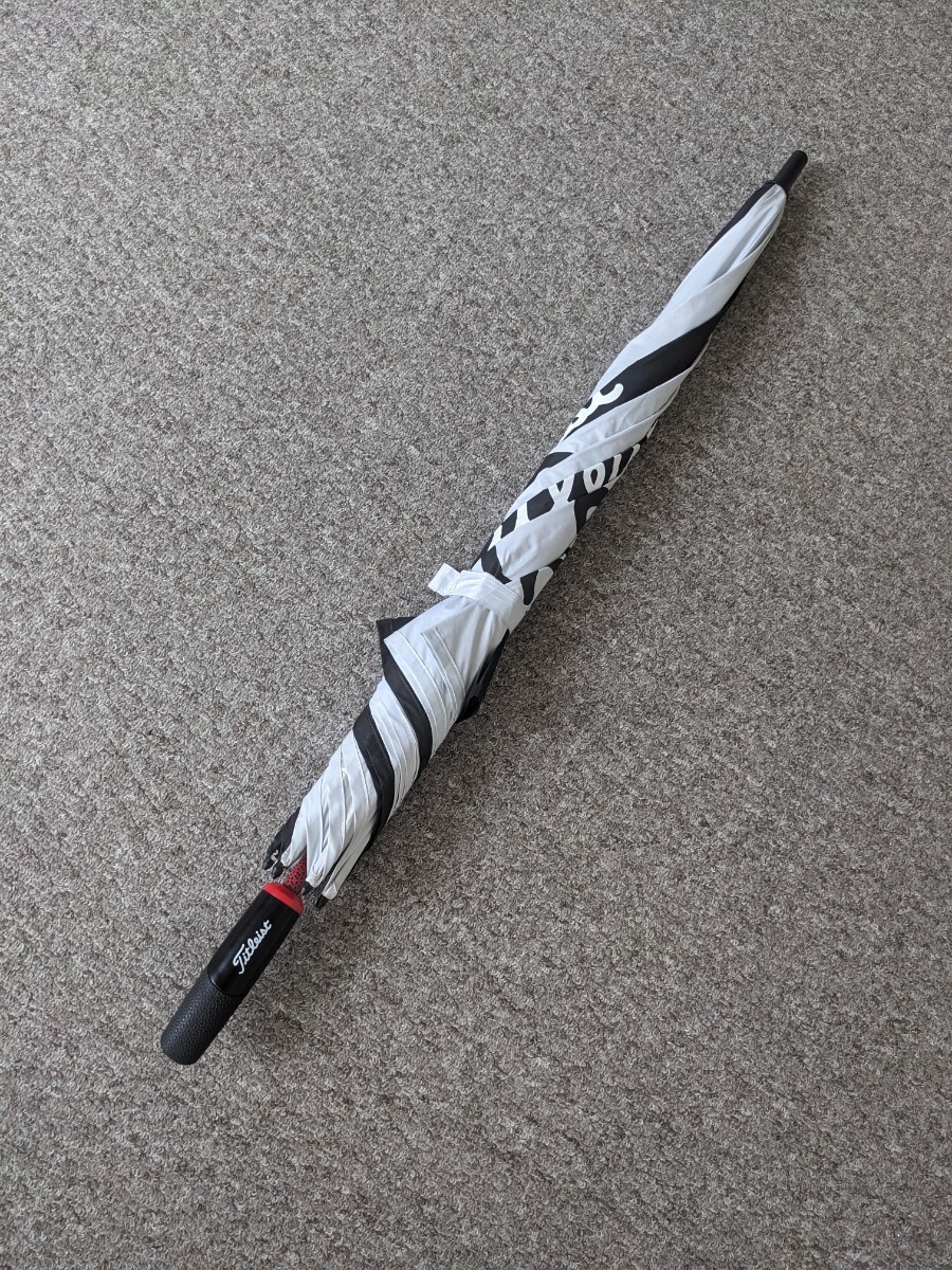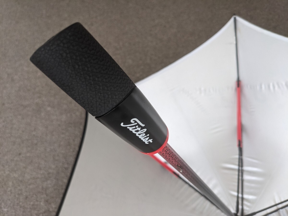 Titleistのロゴが施されたブラックとホワイトのゴルフ用傘。