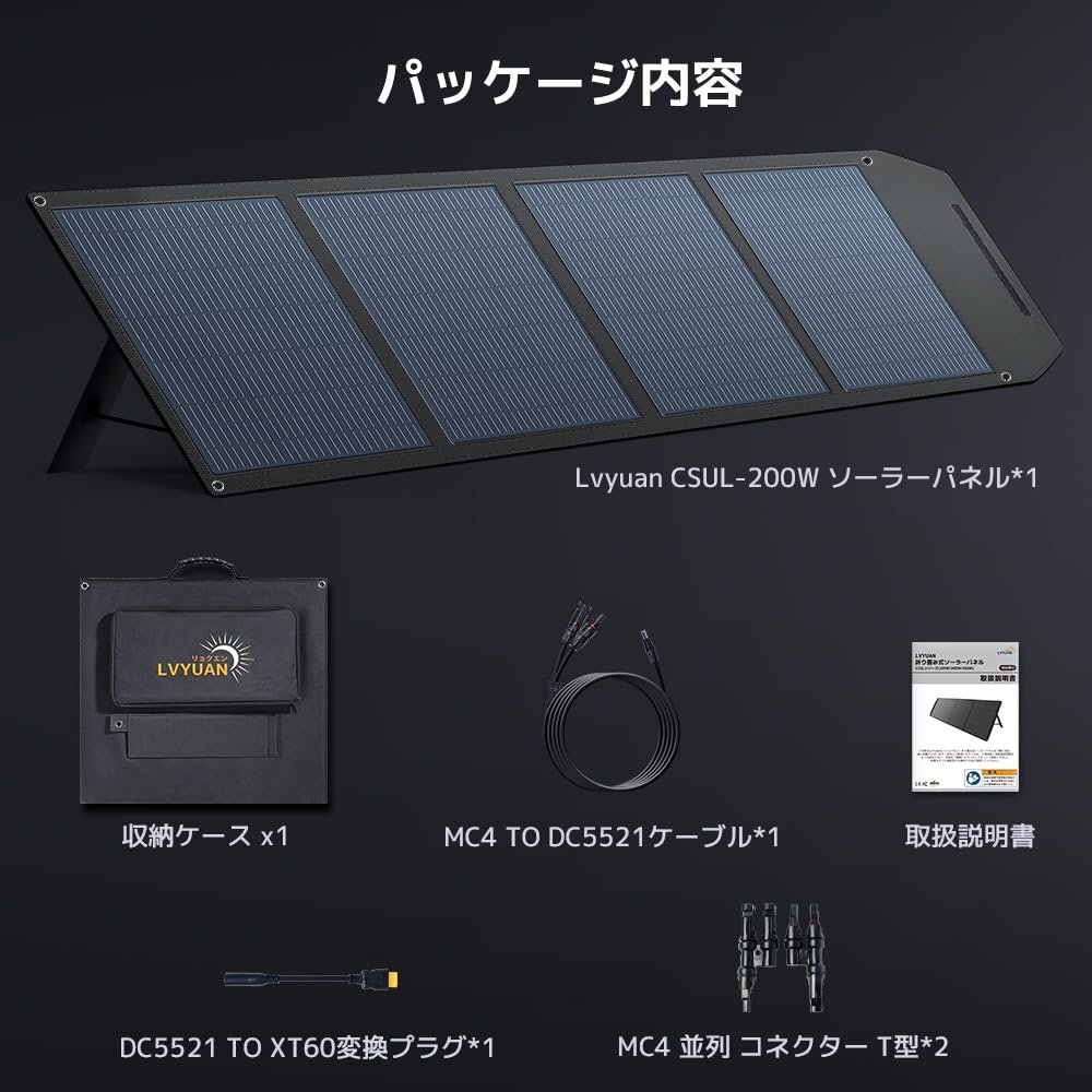 パッケージ内容:LvyuanCSUL-200Wソーラーパネル*1、MC4TODC5521ケーブル*1、DC5521TOXT60変換プラグ*1、mc4並列コネクターT型*2、取扱説明書
