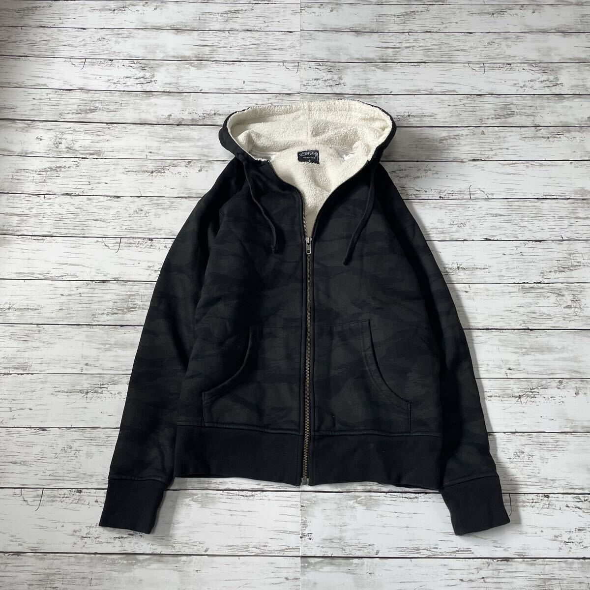 裏地には暖かなボア素材を使用し、寒い季節にも快適な着心地を実現。フロントにはSTUSSYのブランドロゴを配し、シンプルながらもストリート感溢れるカモ柄のデザインが魅力的です。オーバーサイズのビッグシルエットで、トレンドを押さえた一着となっております。ストリートファッションがお好きな方におすすめのアイテムです。
