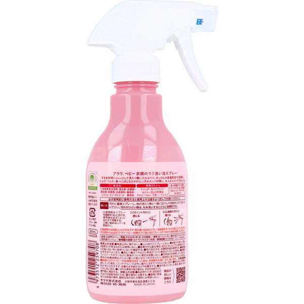 手強い汚れに。 すきま時間にシュッとして洗たく機に入れるだけ。 ・せっけんの高濃度泡(※サラヤ社品比較)が密着し、ミルク・うんち・食べこぼしなどのがんこ汚れのシミ対策に。 大人のエリソデ汚れにも。 ・合成界面活性剤・蛍光剤・抗菌剤・漂白剤・防腐剤・合成香料・着色料・シリコン・リン・アルコール無添加。 ・植物のちから。 ・ラベンダー&スペアミント:ほのかに香る天然精油。 ・アロエ:うるおい天然ハーブエキス。 ・皮ふ刺激テスト済み。 (※すべての方に皮ふ刺激がおきないというわけではありません。) 個装サイズ:93X205X52mm 個装重量:約362g 内容量:280mL 製造国:日本 【発売元:サラヤ株式会社】 【品名】 洗濯用石けん 【用途】 衣料品用(綿・麻・合成繊維) 【液性】 弱アルカリ性 【成分】 純石けん分(20%脂肪酸カリウム) 【使用量の目安】 泡が汚れをおおう程度 【使用回数】 約280回スプレーできます。 【使い方】 ・汚れに直接スプレーし、他の洗たく物と一緒に石けんや洗剤を入れて洗ってください。 汚れがひどい時は、もみ洗いするとさらに効果的です。 ・使用時はスプレー先端部を「出」に合わせ、使用後は必ず「止」に合わせて保管する。 ・使い始めはレバーを数回引く。 ・色柄物にもお使いいただけますが、色の濃いものはスプレー後放置せず、すぐに洗たくしてください。 ・次回からは必ず「アラウ.ベビー衣類のラク洗い泡スプレー」のつめかえ用をお使いください。 【応急処置】 ・目に入った場合、(コンタクトレンズは外し)直ちに流水で15分以上洗い流す。 ・飲み込んだ場合、吐かずに口をすすぎ、多量の水を飲むなどの処置をする。 ・液が皮ふに付いた場合、直ちに水で十分に洗い流す。 ・いずれも異常が残る場合は、製品を持参のうえ、専門医に相談する。 【使用上の注意】 ・用途以外に使わない。 ・人に向けてスプレーしない。 ・家庭での洗たく禁止(絵表示)があるものには使用しない。 ・色落ちが心配な場合、目立たないところに原液をつけ、5分後に白い布に色移りしないか確認する。 ・荒れ性の方は、炊事用手袋を使用する。 ・使用後は手を水でよく洗う。 ・洗たく機のフタなどに原液がついた場合は十分にふき取る。 ・金属のファスナーやボタンなどに原液がついた場合は放置しない。 ・天然成分を使用しているため、原料の収穫時期などにより香りや色にばらつきが生じたり、経時的に変化することがある。 ・乾燥によりスプレーの先端部が詰まった時は、先端部をお湯につけ、洗い流す。 ★保管上の注意 ・乳幼児や小児、認知症の方などの誤飲を防ぐため、置き場所に注意する。 ・極端に高温または低温の場所、直射日光の当たる場所には保管しない。 注意事項 ※予告なく成分・パッケージが変更になることがございます。 予めご了承ください。 *予告なく成分・パッケージが変更になることがございます。予めご了承ください *ダンボールを使用して発送する場合には、入数以下の個数の場合、 中古ダンボールを使用する場合があり、ご注文の商品とは異なるダンボールになる場合があります。 あらかじめ、ご了承ください。 |