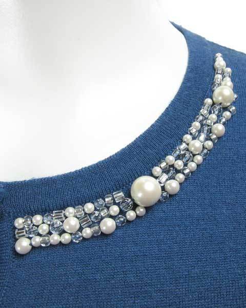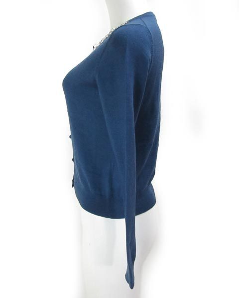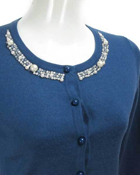 | 落ち着いた青の上品なカーディガン。カジュアルスタイルからキレイ目スタイルまで幅広くボトムスをあわせて頂けます。飽きのこないデザインで長く着て頂けます。お顔周りにパールがついていて、華やかになります。 |