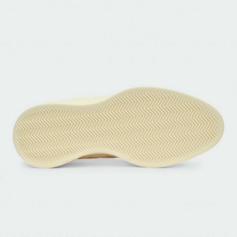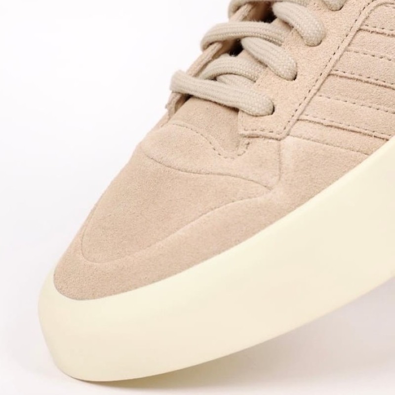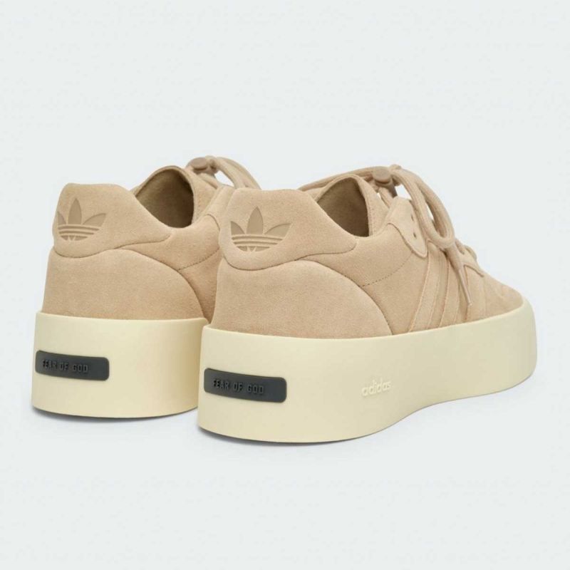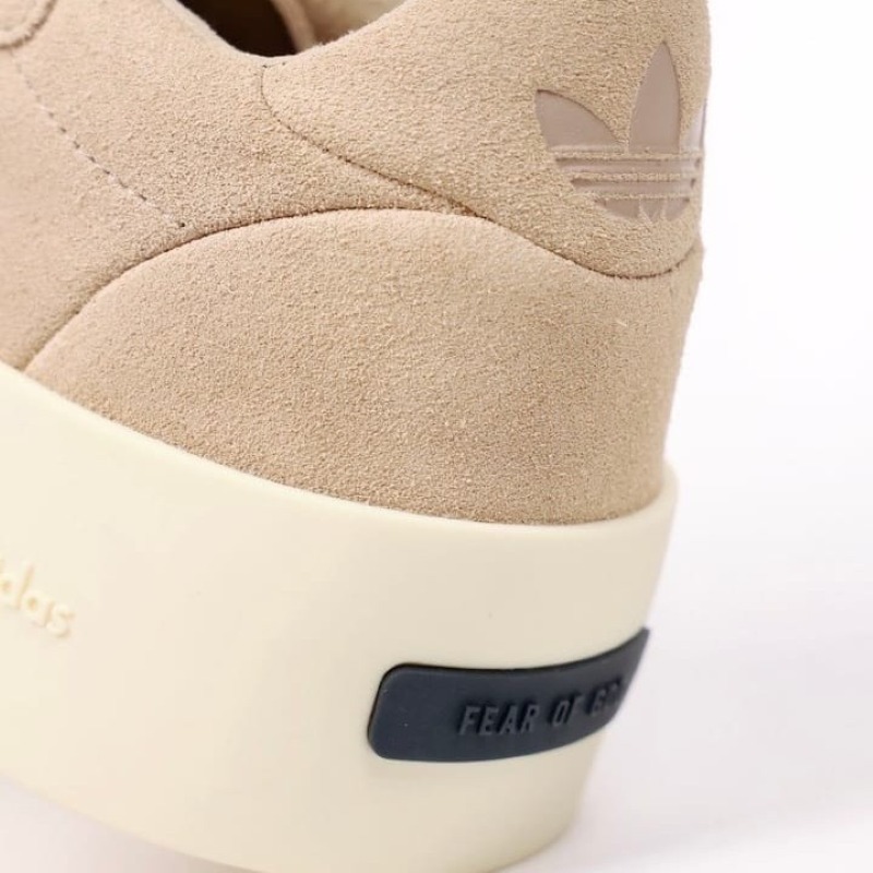 ヒールタブにはadidasのブランドロゴが入り、ソールのかかとにはFear of Godの名を誇らしげに示す