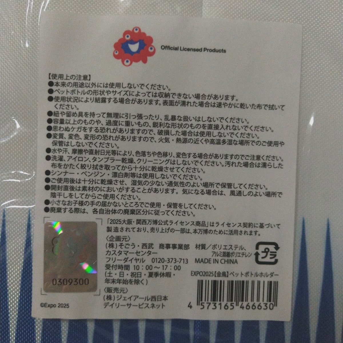 大阪・関西万博公式ライセンス商品、ミャクミャクと金鳥コラボのペットボトルホルダーです。