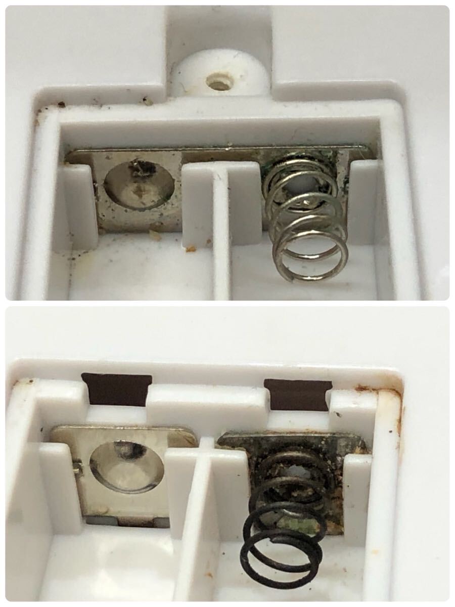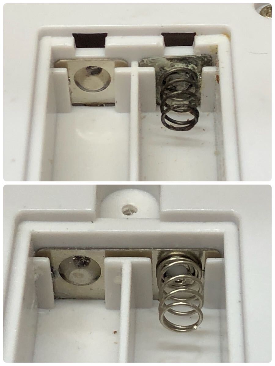 電池入れ内、黒くなっている金具があり。恐らくは電池の液漏れの影響かも知れません。