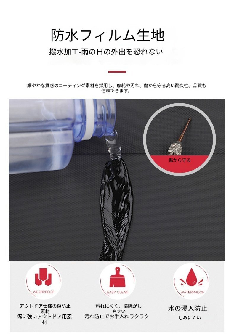 高品質な防水素材を使用し、雨の日でも安心。止水ファスナー搭載で水の侵入をしっかりガード。内部には耐衝撃クッションを備え、大切な電子機器や貴重品をしっかり守ります。