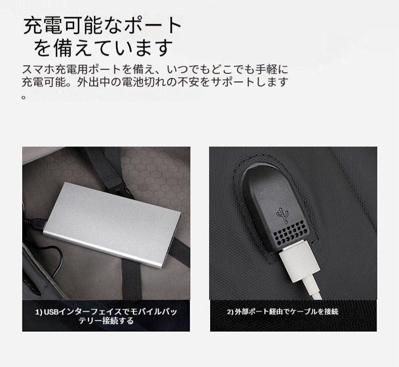 外部USB充電ポートを搭載。モバイルバッテリーをバッグ内に収納したまま、スマートフォンやタブレットを外出先で手軽に充電可能です。