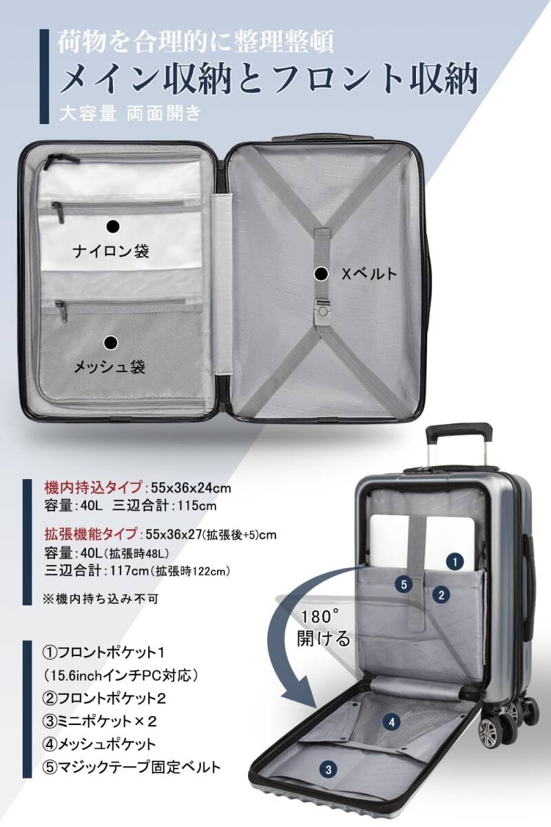 【商品仕様】拡張機能なしタイプ:容量40L・外寸55×36×24cm(三辺合計115cm)で機内持ち込み可能です。拡張機能付きタイプ:最大容量48L(拡張後)・外寸55×36×27cm(三辺合計117cm)で機内持ち込み不可です。