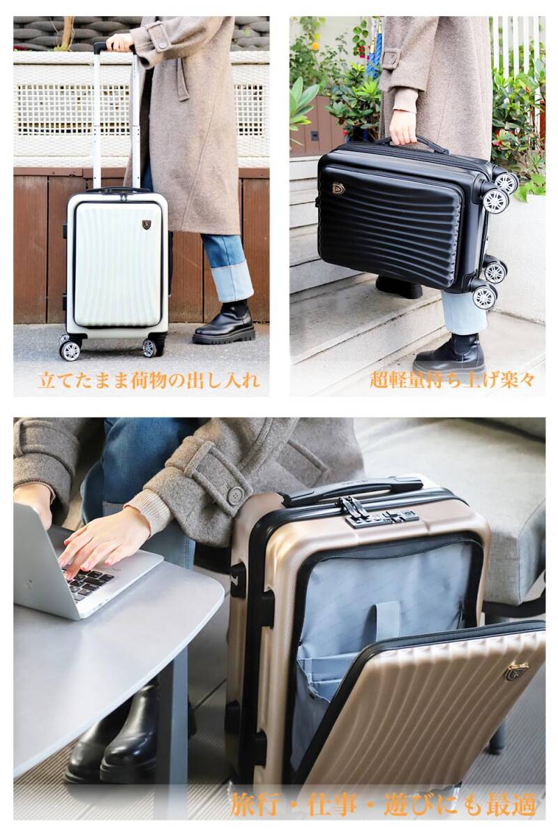 【フロントオープン&USB充電ポート付き】立てたまま荷物の出し入れができる便利なフロントオープンスーツケースです。15.6インチまでパソコンやタブレット、パスポートなど荷物に合わせた細かなポケットがあり、空港や新幹線の中、旅の途中でも、前ポケットから出したいものを簡単に取り出すことができ、子連れの方やビジネスシーンでも活躍しています。便利なUSB充電ポート付き、場所を選ばずいつでもどこでも移動しながら効率よく充電ができます。