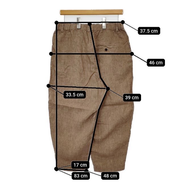 実寸サイズ | 総丈:約83cm ウエスト:約37.5cm ウエスト最長:約45cm 股上:約39cm 股下:約48cm ヒップ:約46cm ワタリ幅:約33.5cm 裾幅:約17cm ※採寸画像がある商品はハンガーに吊るした状態での計測のため、平置きでの採寸とは差が生じる場合がございます。平置きでの実寸サイズをご希望の場合は、ご購入前に必ずご質問ください。 ※記載以外のサイズが合わないことを理由とした返品はできませんので、 記載部分以外で実寸サイズの気になる箇所があれば必ず購入前にご質問ください。 |