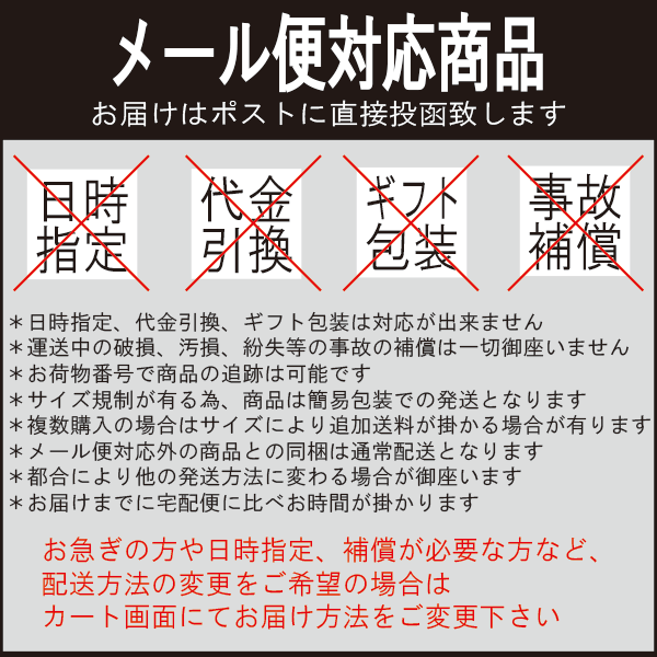 | 返品・交換について | お客様都合の場合一切返品交換は出来ません。 ただし、不良品交換、誤品配送交換は当社負担とさせていただきます。 万一不良品または誤品配送がございましたら、当店の在庫状況を確認のうえ、新品、または同等品と交換させていただきます。 商品到着時に必ず、 ご注文の商品にお間違いが無いかご確認お願い致します。 商品に間違いや運送時と思われる破損が御座います場合は、 お手数をお掛けしますが、 到着後48時間以内にメールでご連絡をお願い致します。 至急、対応させて頂きます。 48時間を超えた場合は対応できかねますのでご了承下さい。 但し、一度でも使用した物や付属品を無くした物等の場合は一切返品交換いたしませんのでご注意下さい。 不良品は商品到着後7日以内にメールまたは電話でご連絡ください。 それを過ぎますと交換のご要望はお受けできなくなりますので、ご了承ください。 |