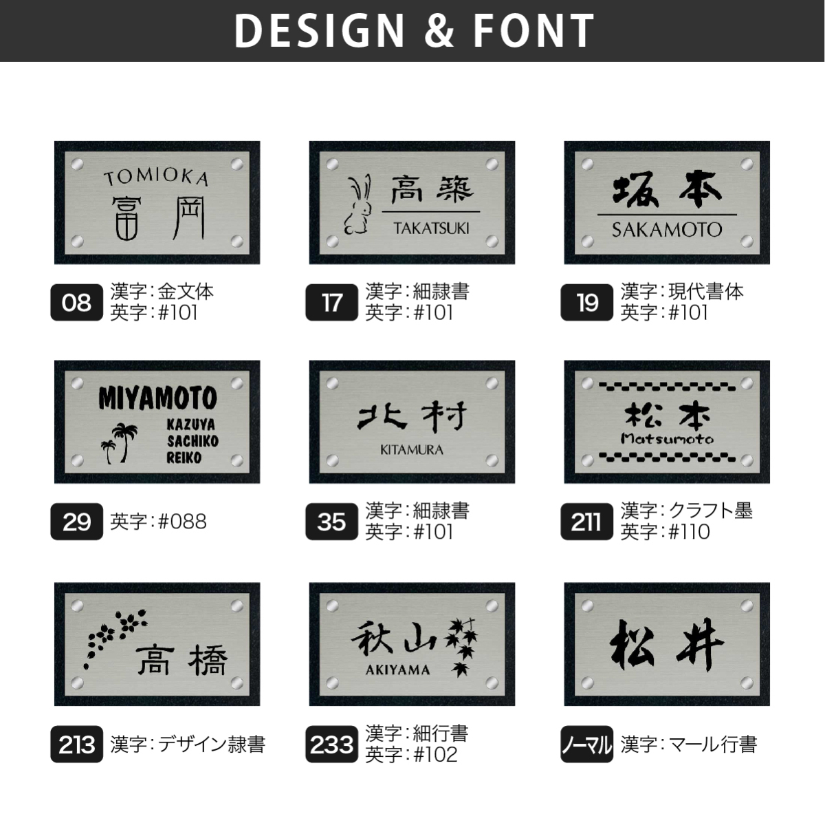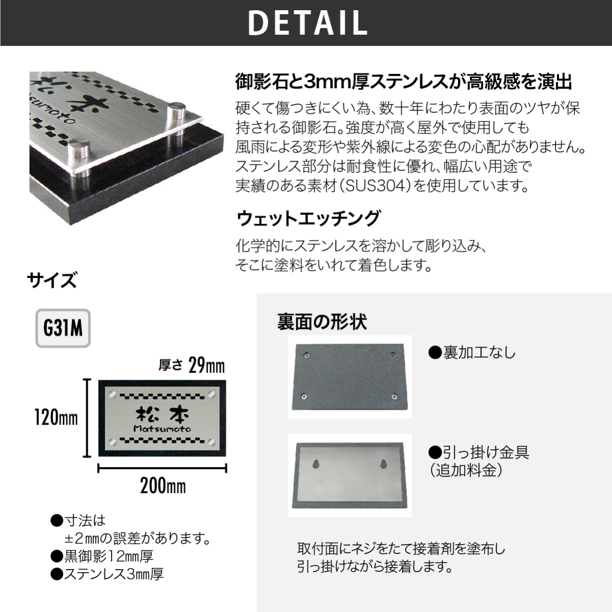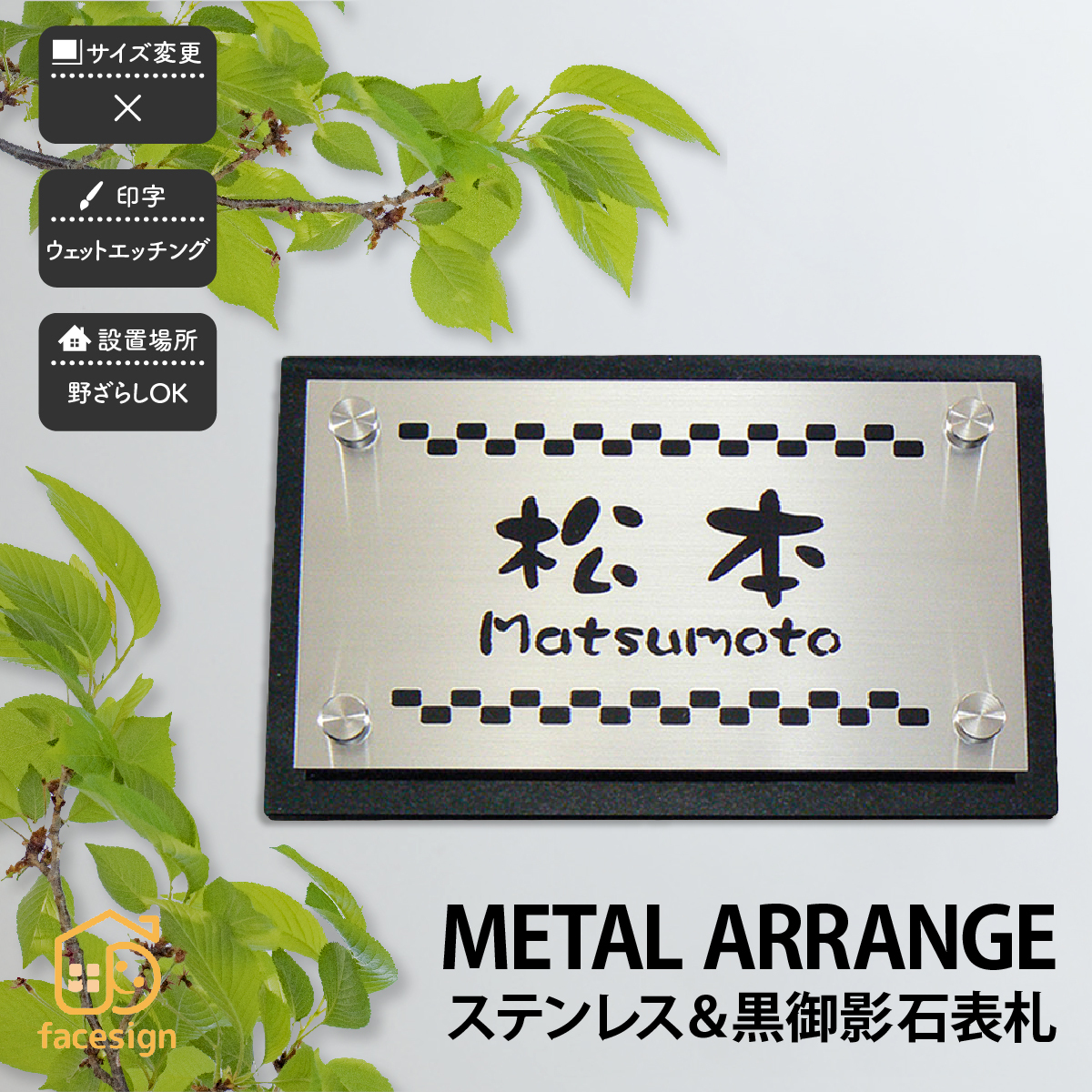| 商品詳細 | 御影石とステンレスの相性は抜群。3mm厚のプレートとステンレス金具が高級感を演出します。ベースの御影石は硬くて傷つきにくい為、数十年にわたり表面のツヤが保持されます。また耐薬品製に優れ、化学物質にも侵されにくい素材です。強度が高く屋外で使用しても風雨による変形や紫外線による変色の心配がありません。ステンレス部分はステンレスの中でも耐食性に優れ、幅広い用途で実績のある素材(SUS304)を使用しています。化学的にステンレスを溶かして彫り込み、そこに塗料をいれて着色します。 |