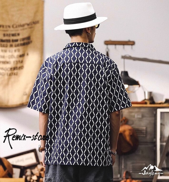 ★1円セール サイズXL レトロ 60’s ウェーブ キューバ カラー オープン アロハ シャツ ブルー 半袖 幾何学的 メンズ ヴィンテージ★t688