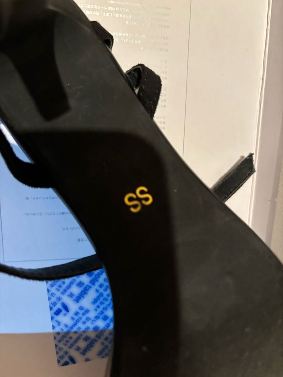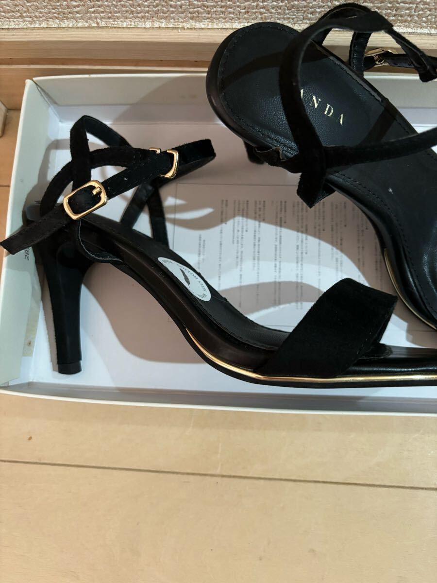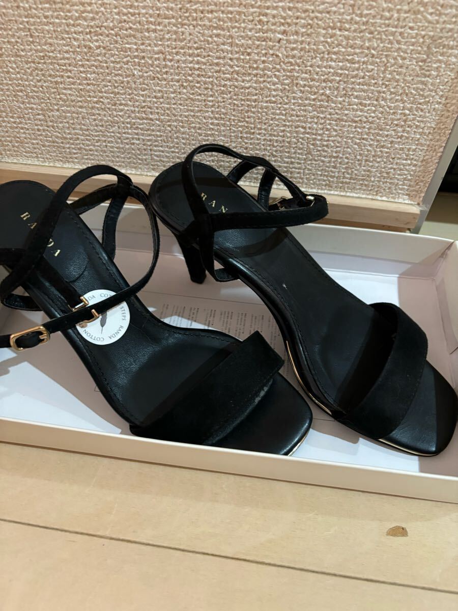 ブラックのストラップサンダル、エレガントなデザインで中ヒール。