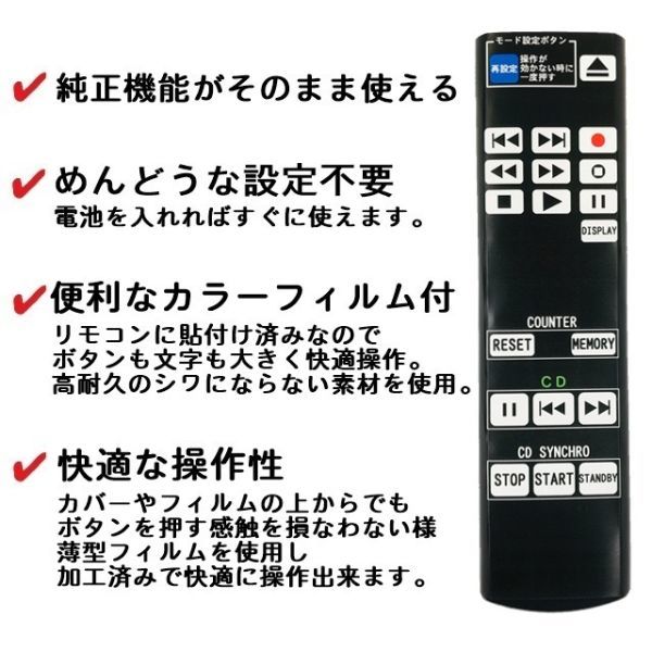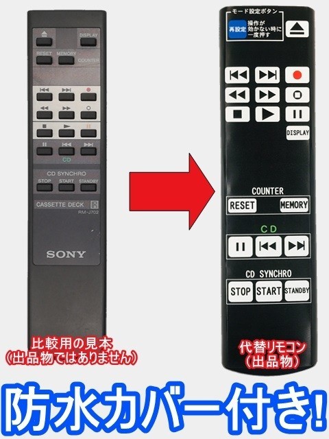 | 【商品名】 SONY RM-J702 代替リモコン 【対応機種】 TC-K555ESG TC-K333ESG 上記機種以外については、質問欄よりメーカーと型番をご連絡頂ければ、対応品のご案内をしております。 【商品について】 右側の代替リモコンが出品物になります。左側のリモコンは見本画像です。 タイトル機種のリモコン信号を入力学習した純正リモコンと同等の代替リモコンです。 電池を入れれば、純正リモコンと同様にすぐお使い頂けます。 内部メモリに学習している為、電池交換をしても入力信号は消えません。 【付属品について】 防水リモコンカバーをお付けします。 ボタン機能を印刷した薄型フィルムはリモコンに貼付け済みです。 乾電池は付属しません。別途ご用意下さい。(単4乾電池×2本) 【発送について】送料無料 迅速発送を心掛けております。土日祝日はお時間を頂く場合ございます。 ポスト投函配達となり、日時指定は出来ません。 | ||
