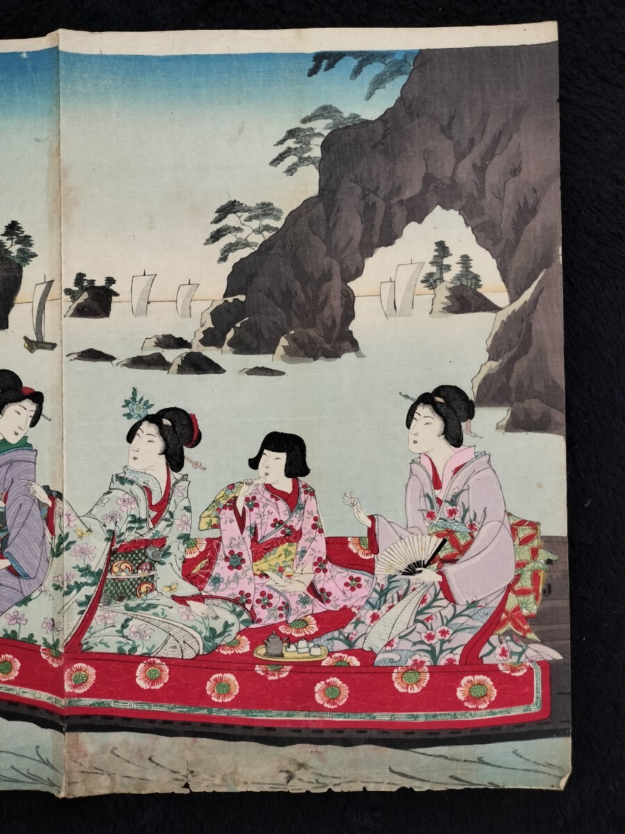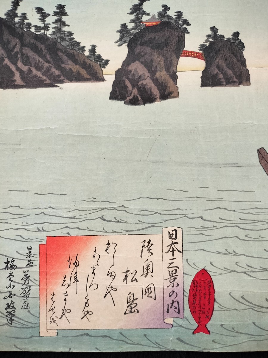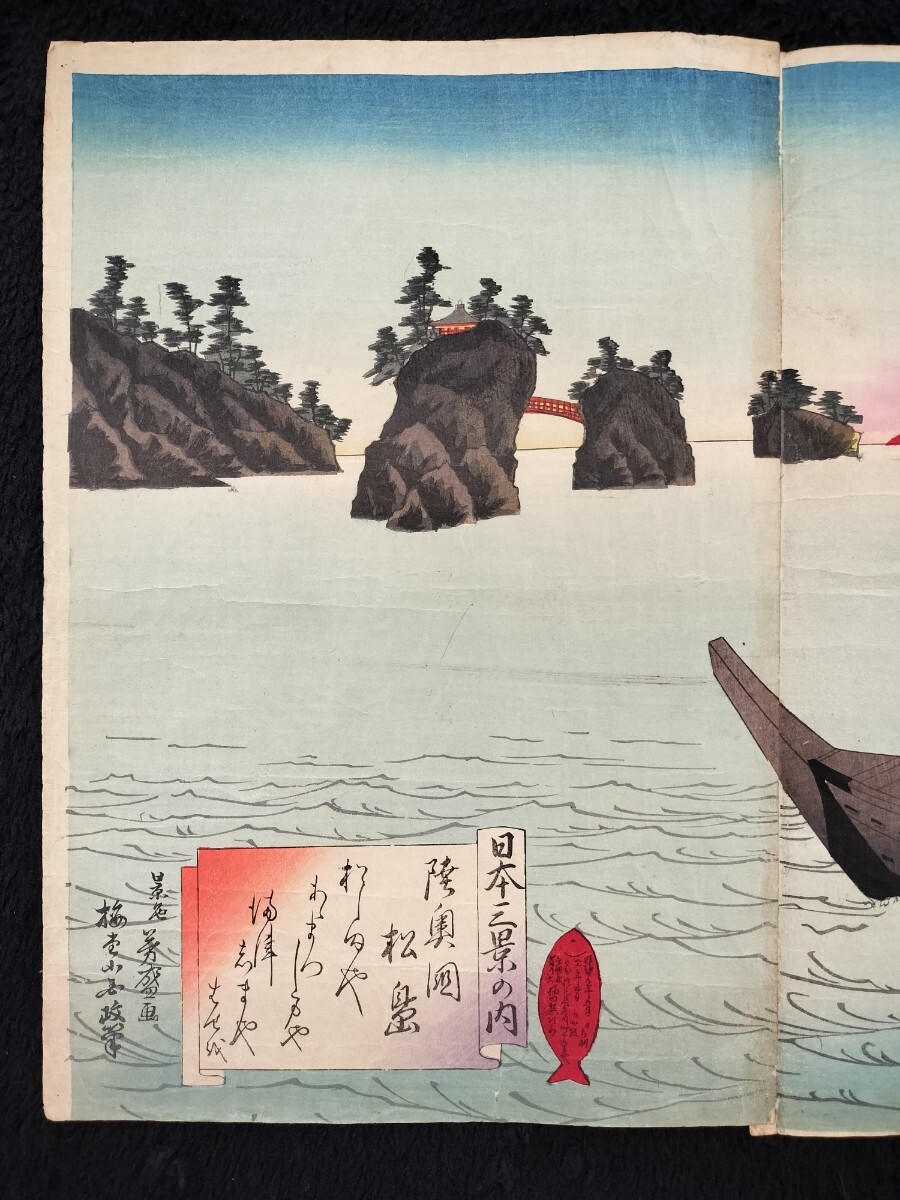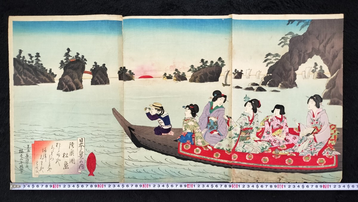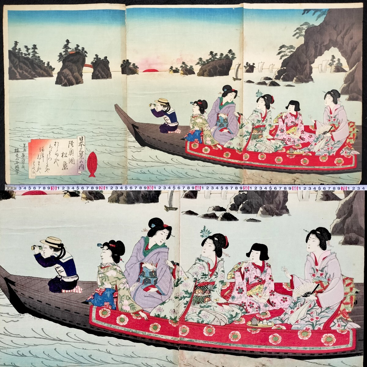 明治期/真作 歌川国政 歌川芳盛「日本三景の内 陸奥国松島」本物浮世絵木版画 名所絵 錦絵 大判 三枚続き