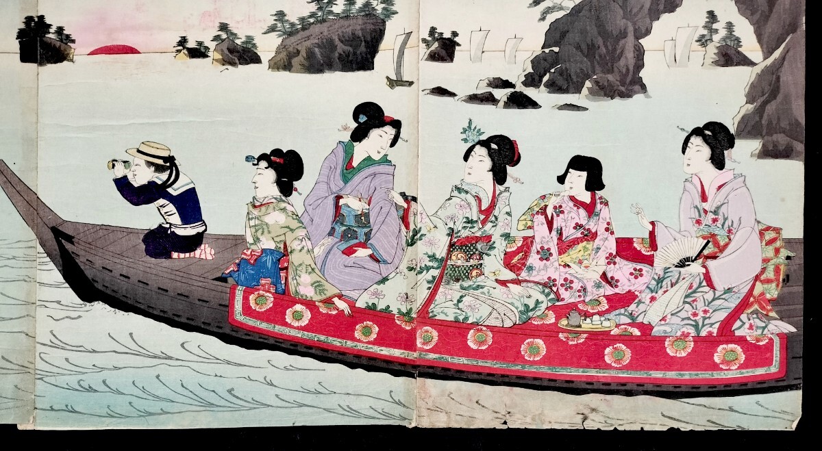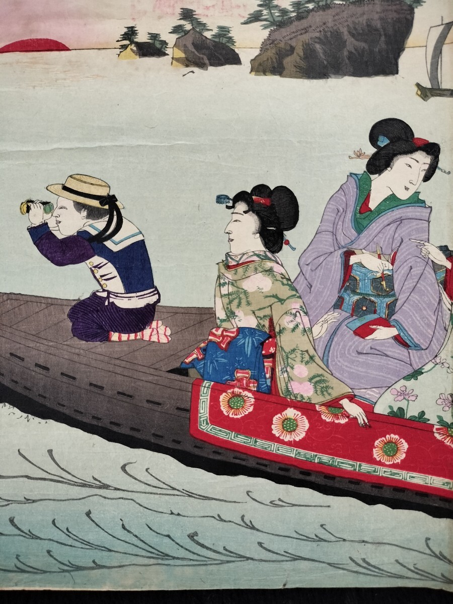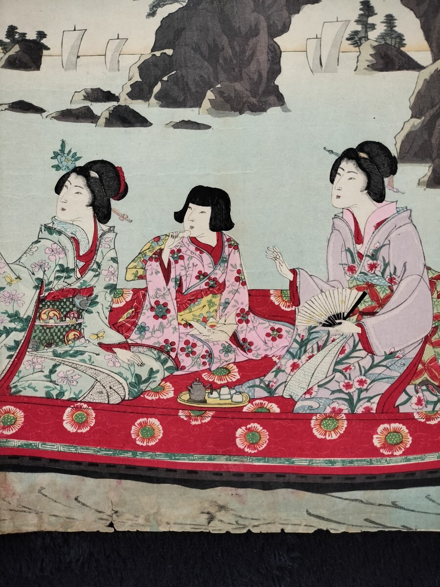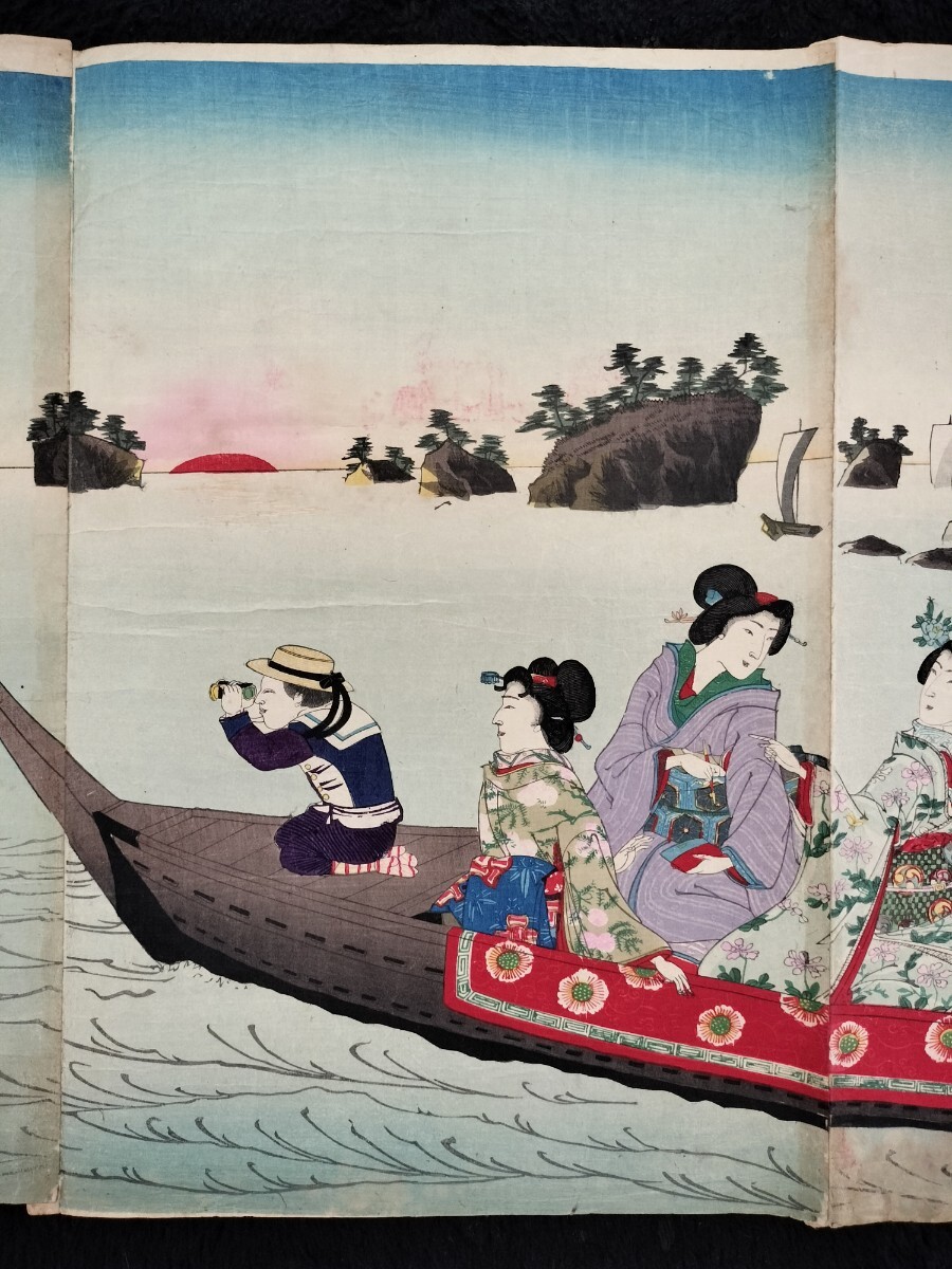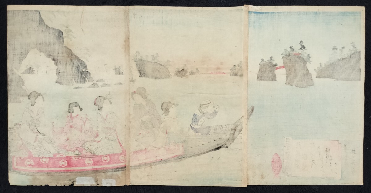 明治期/真作 歌川国政 歌川芳盛「日本三景の内 陸奥国松島」本物浮世絵木版画 名所絵 錦絵 大判 三枚続き