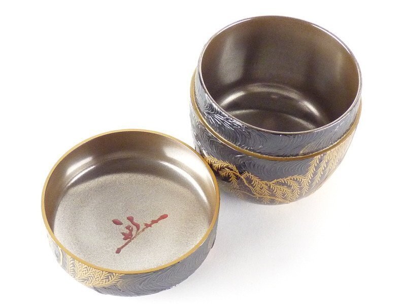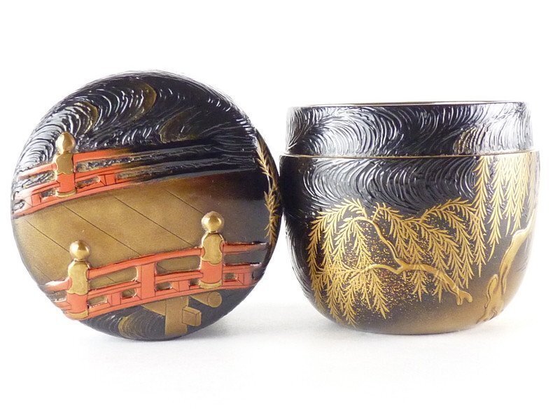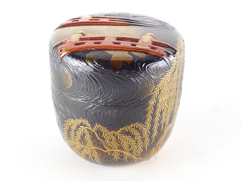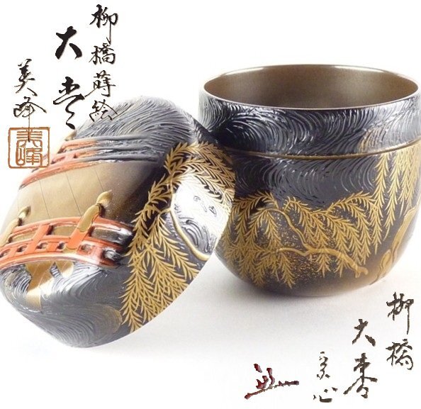 【都屋】s2 奥野美峰「柳橋蒔絵 大棗」内銀地 堀内宗心書付 在判 共箱 高さ 約7.5cm 幅 約7.5cm 木製 棗 香合 茶碗 茶道具 輪島塗