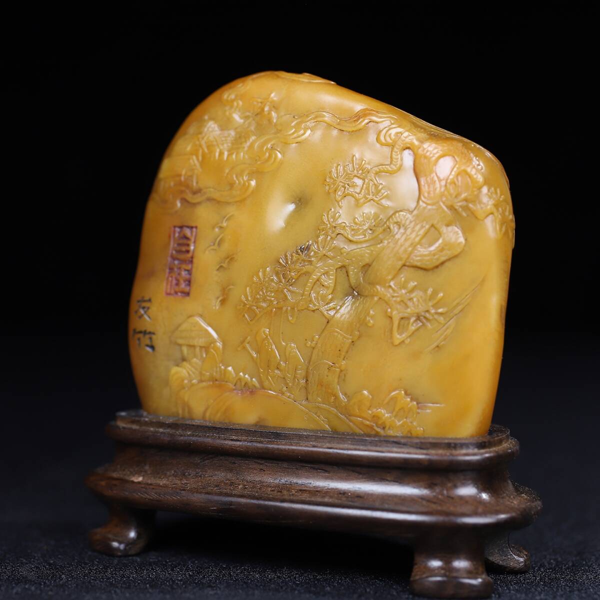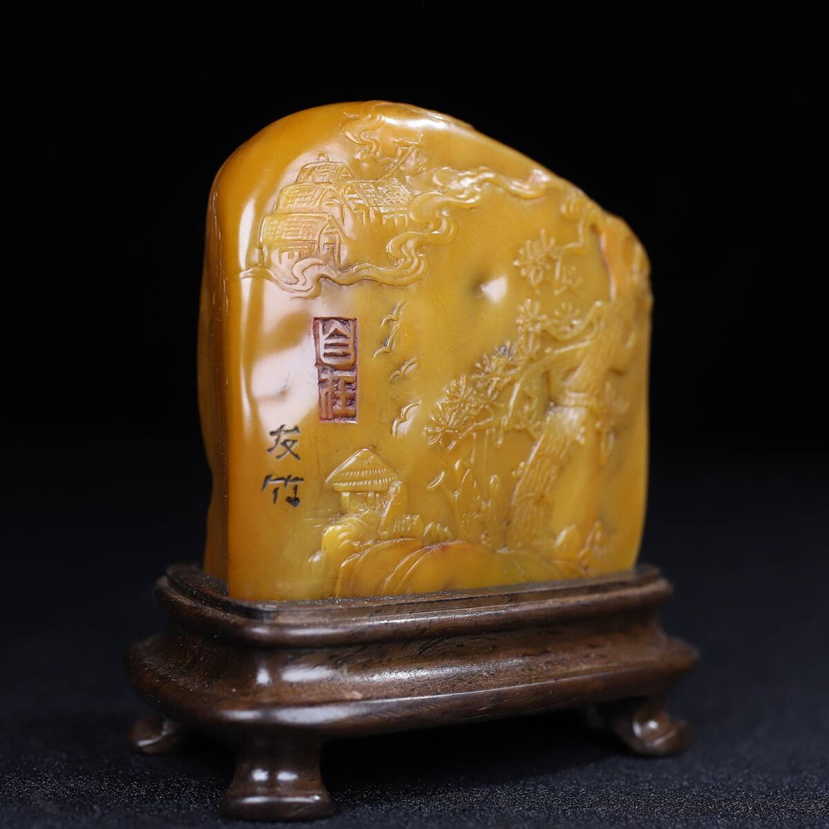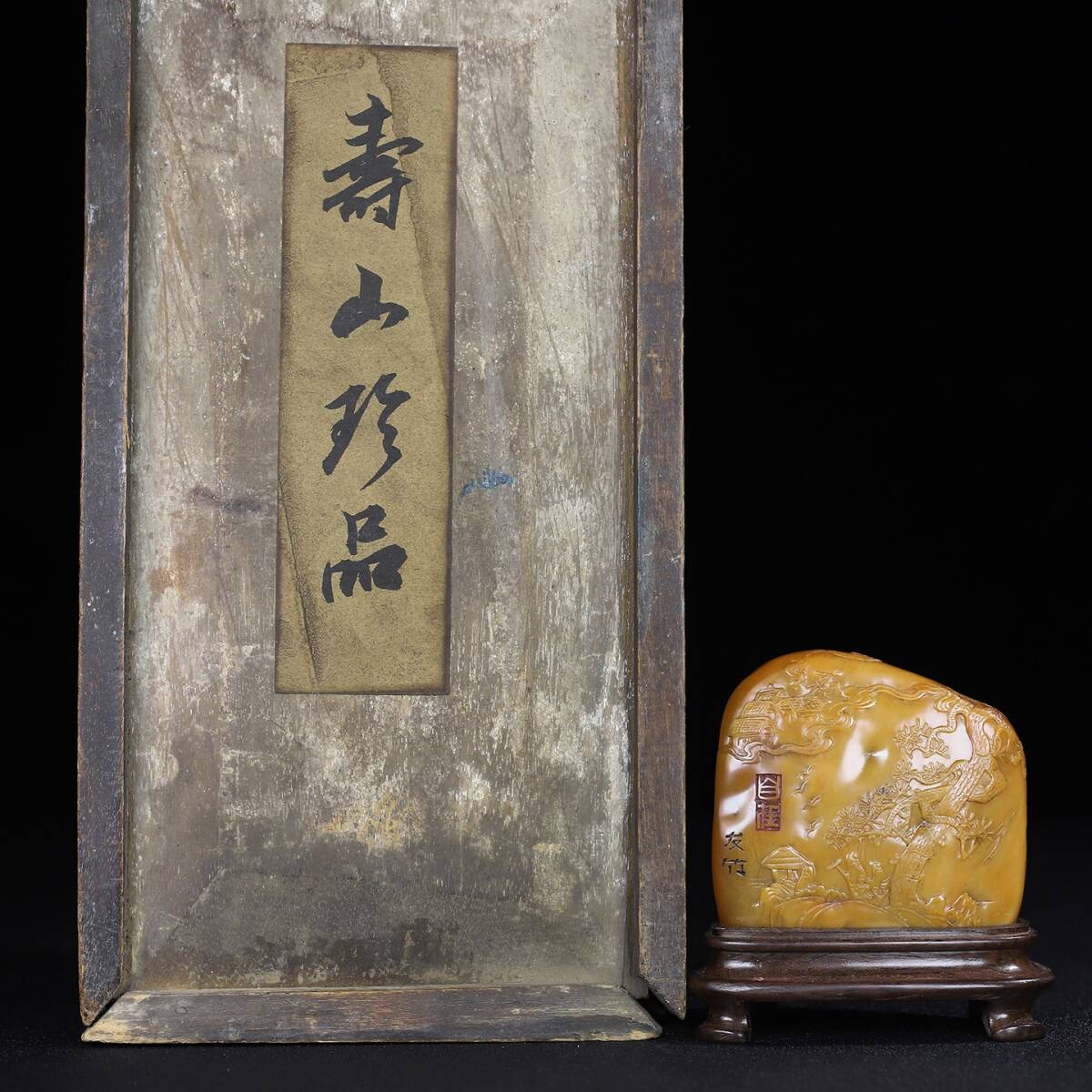 唐物 【清代篆刻家 徐堅 號:友竹】寿山石 細密彫 松下聚賢 人物紋 薄意の置物 天然石 手彫 篆刻 極細工 中国古玩 骨董品 古美味 D69