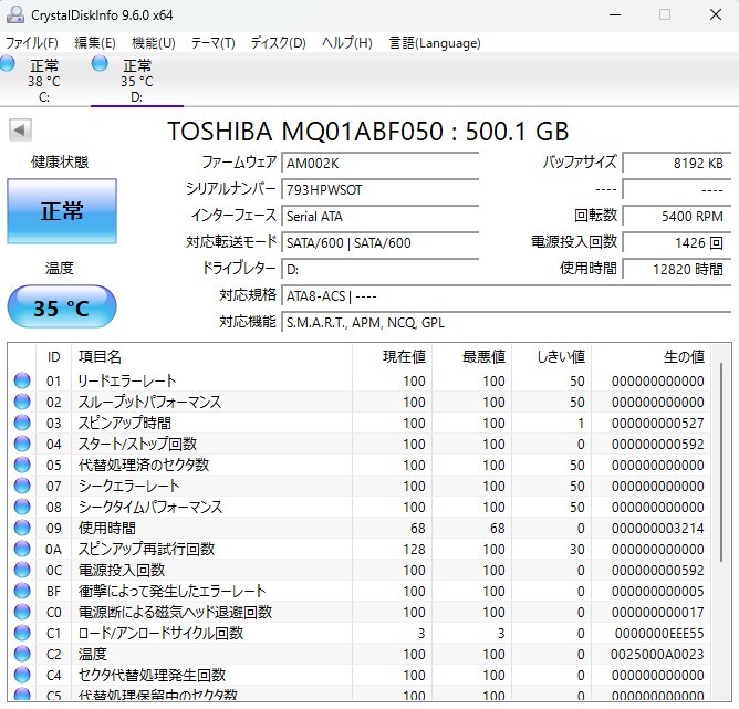 500GB 診断結果:正常、電源投入回数:1,426 回、稼働 時間:12,820 時間 ※オプションで変更可(お見積もり) |