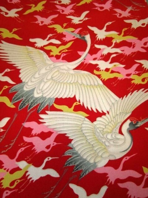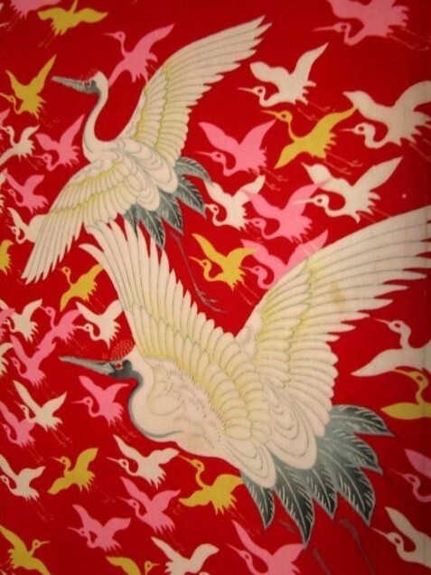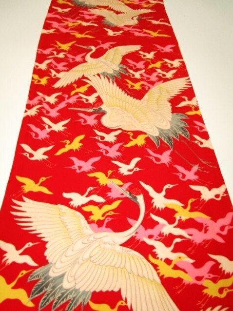 F-56★赤地*鶴*飛鶴がたくさん*正絹*古布はぎれ★吊るし雛/市松人形/一閑張り/文化人形/タペストリー