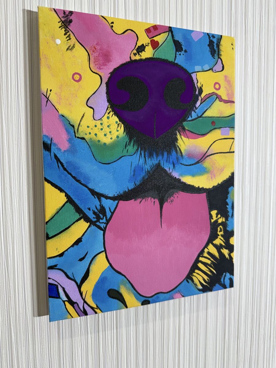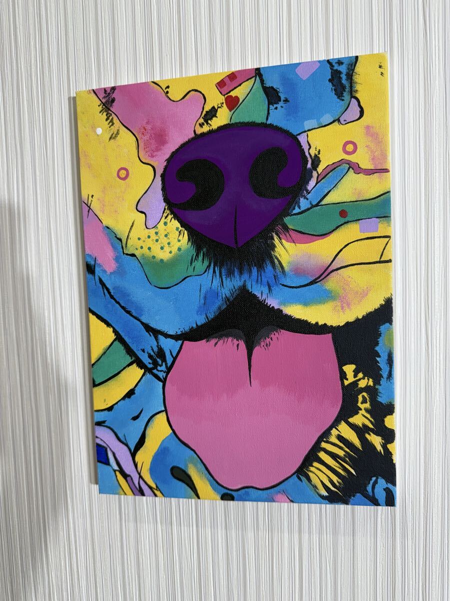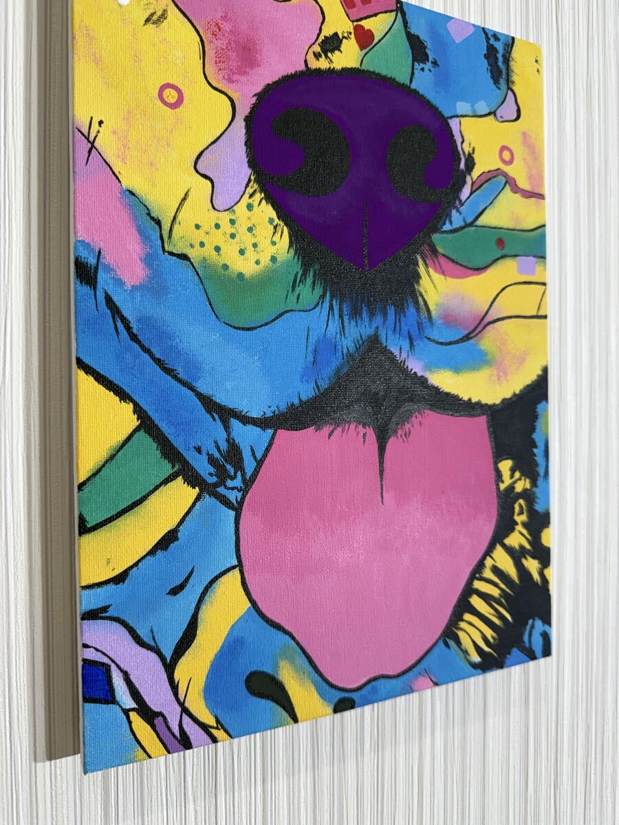 カラフルな犬の顔を描いたポップアート作品。