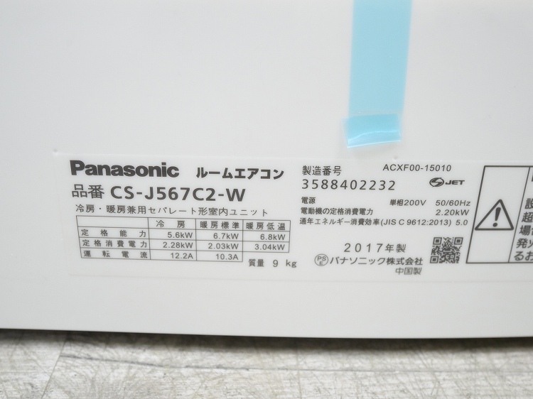 【未使用品】【室内機のみ】Panasonic製/ルームエアコン/18畳用/CS-J567C2-W(7090475-2/2)