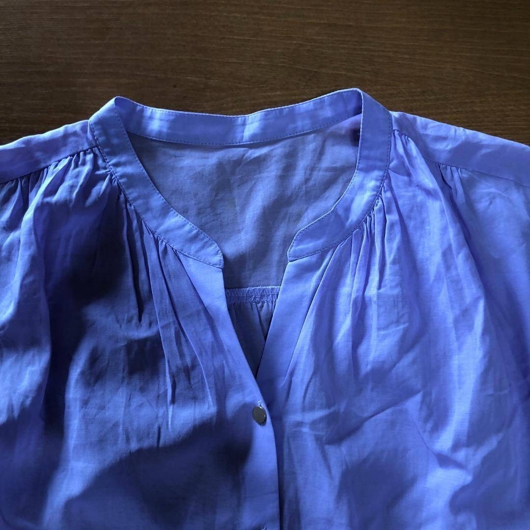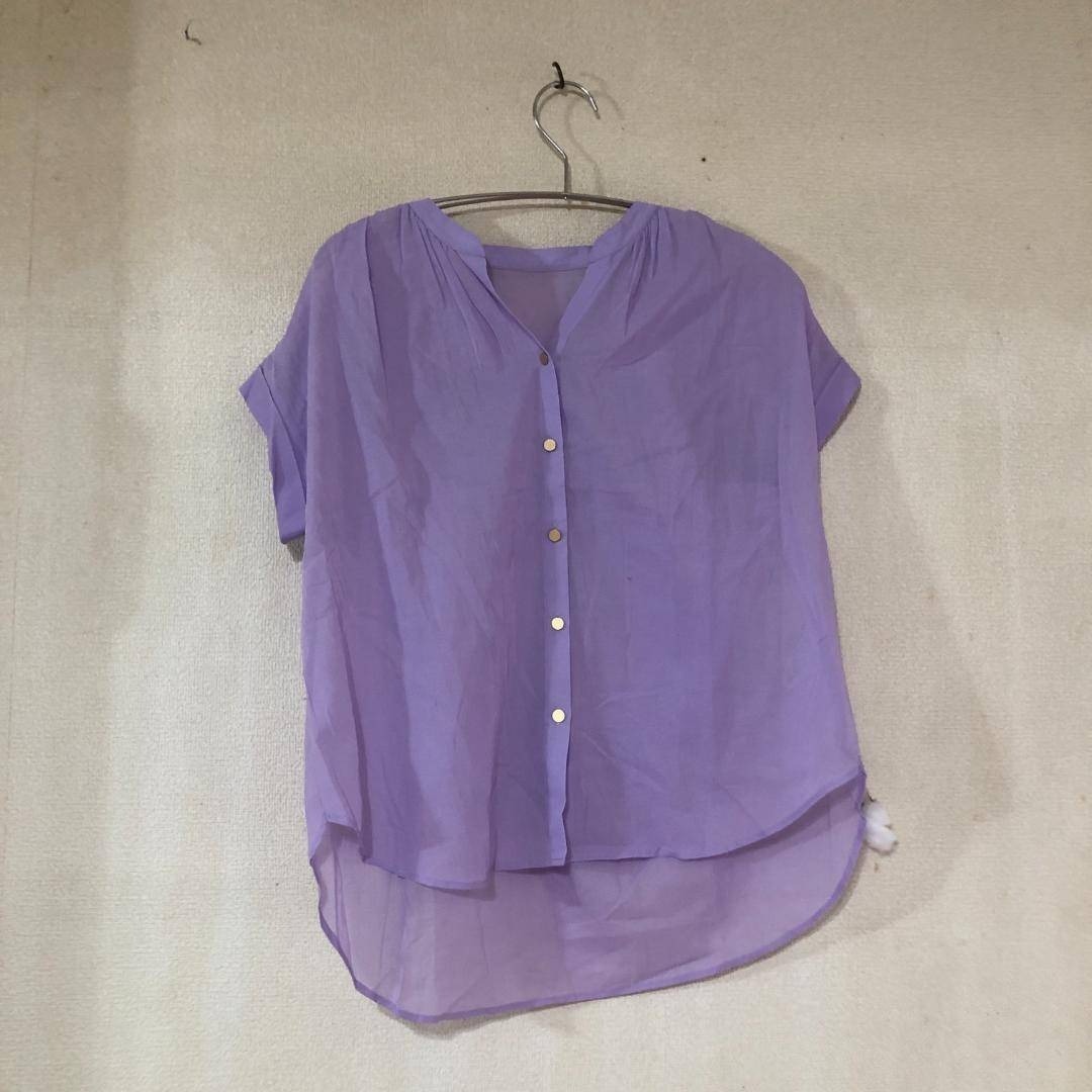 透け感のあるシアー素材が軽やかな、パープルカラーの半袖ブラウスです。