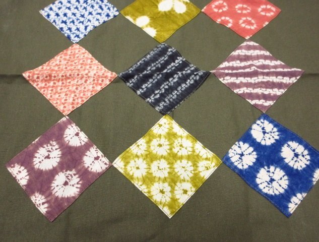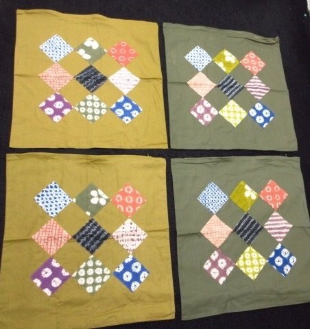 未使用保管品 しぼり染め 座布団カバー まとめて 4点 クッションカバー等 カーキ/ブラウン系 和柄 和風インテリア 綿100% 愛知県絞工業組合