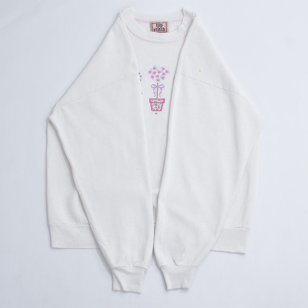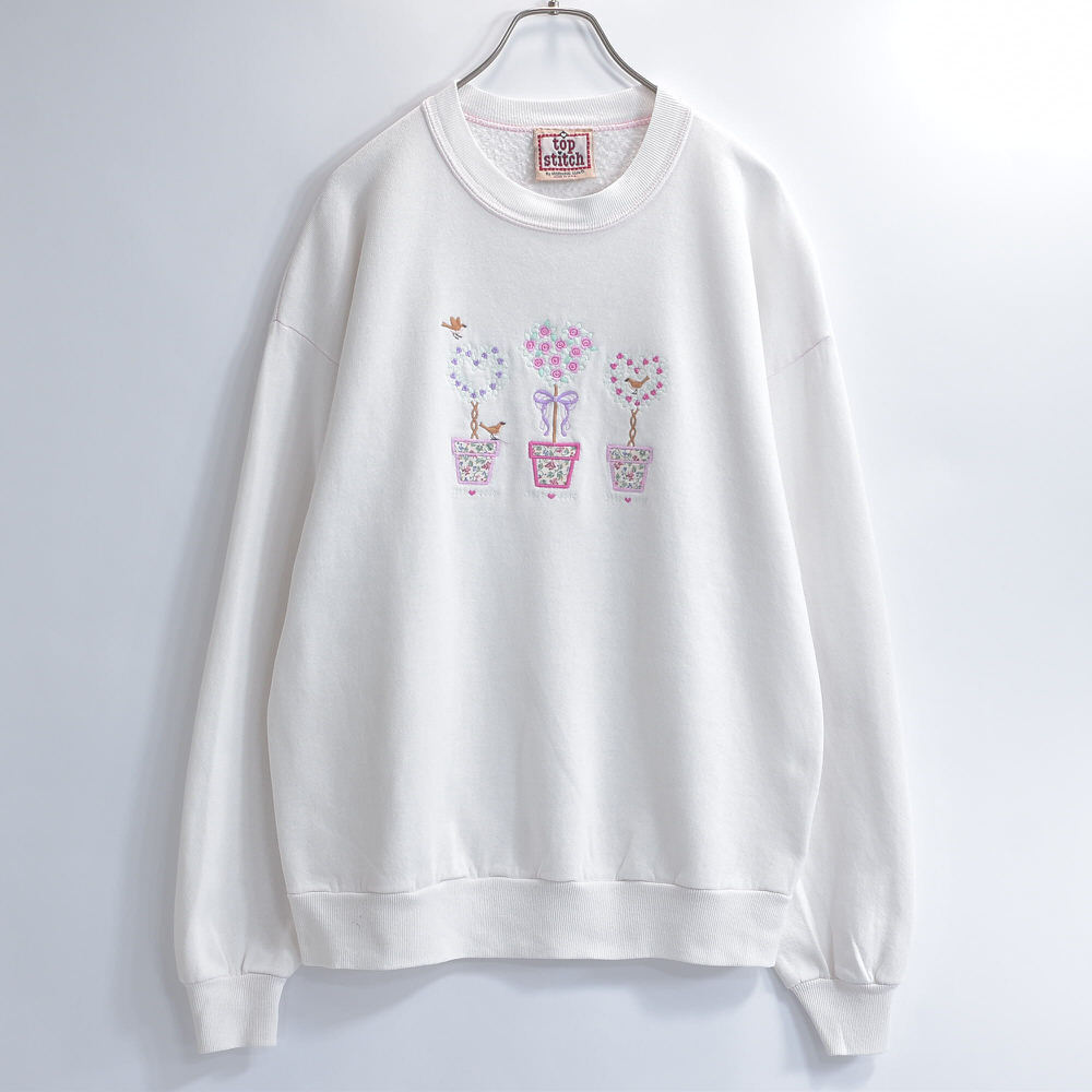 90s USA製 Top Stitch by Morning Sun トップステッチ ハート トピアリー 刺繍デザイン アート スウェット トレーナー ホワイト ヴィンテージ ビンテージ USA アメリカ古着 レディースXXL相当