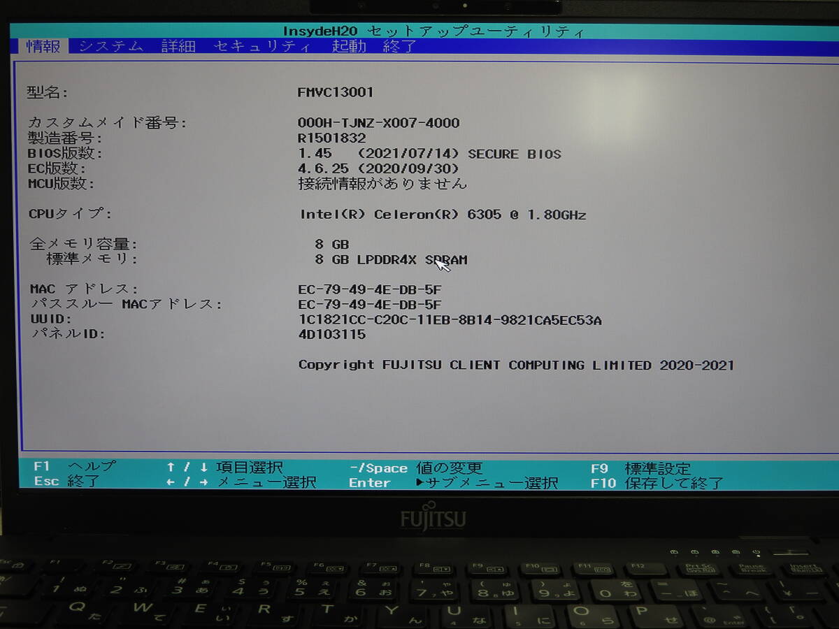 富士通 FUTRO U9311/M CPU:Celeron 6305 メモリ:8GB SSD:128GB (商品状態) 全体的にはキズ、スリキズ、磨耗等あります。 底面、ゴム足欠品しています。 液晶部、白シミ、キーボード接触痕があります。 通電しBIOSのみ起動確認済みです。 上記理由につきジャンク品として出品します。 付属品 なし ※ジャンク品につき保証対応無し |