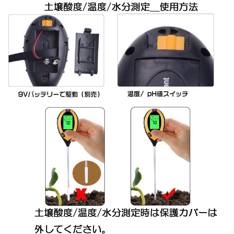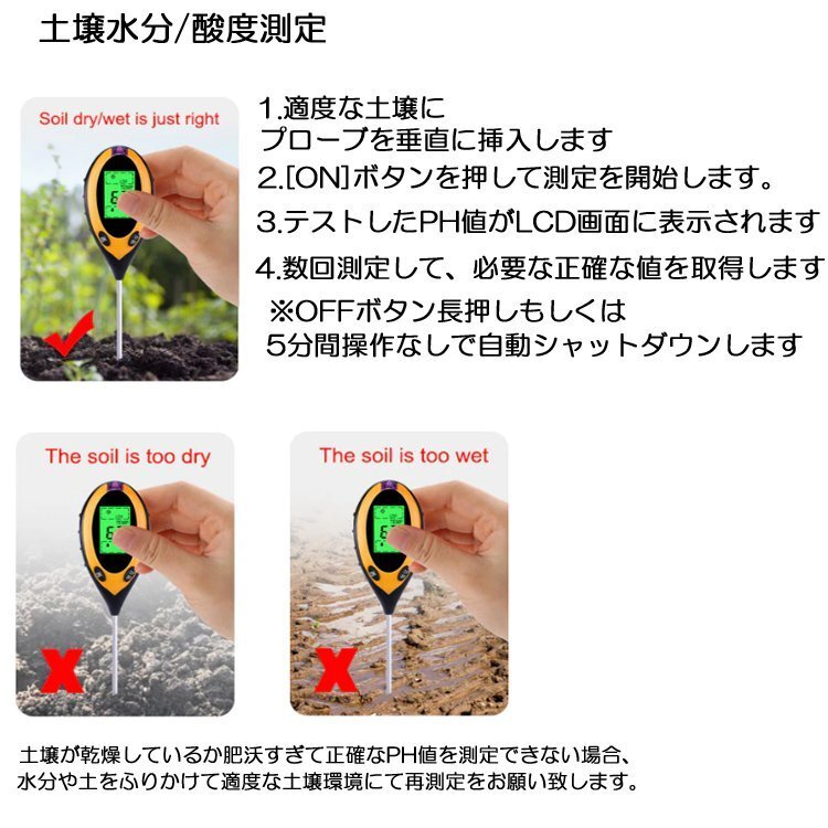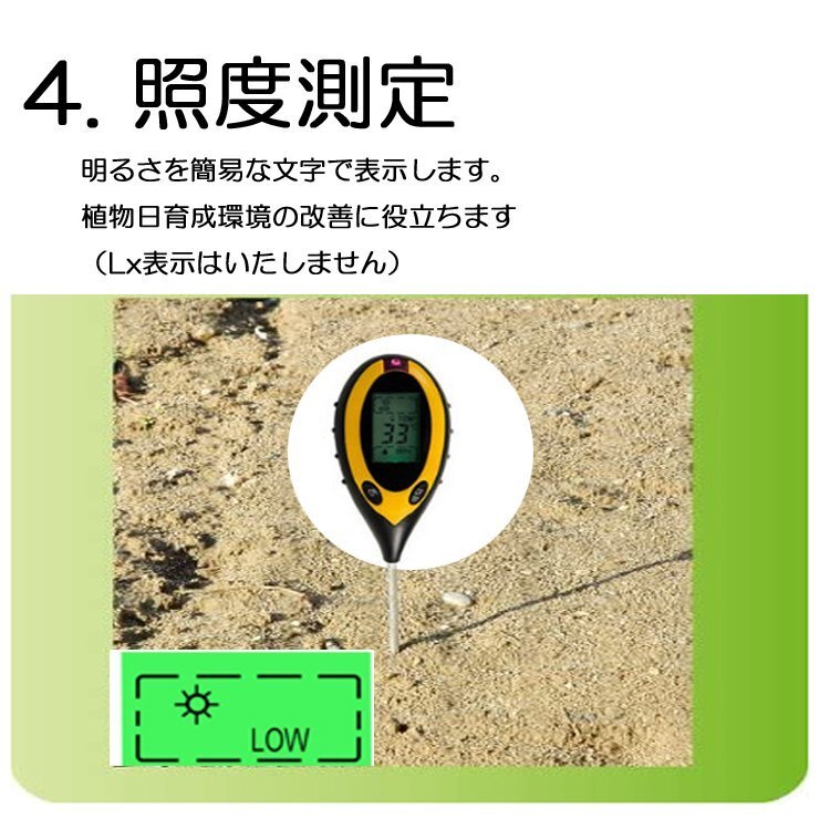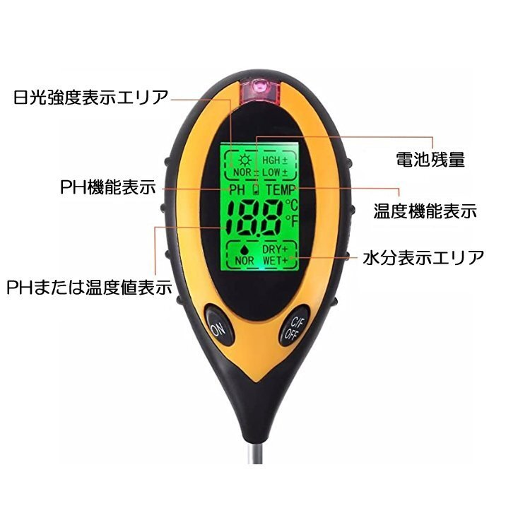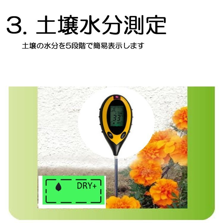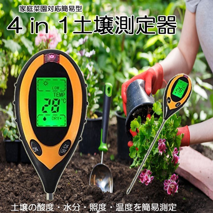 ◆マルチ機能土壌測定器 4in1 土壌テスター デジタル式 土壌酸度計 地温 PHメーター 水分 照度/水分含有量/温度 多機能 農業 園芸用品 家庭菜園にも 簡易型 屋内/屋外可 DDPH41