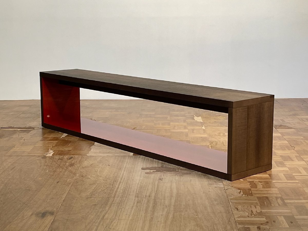 最高級オーク材のゆったりとした杢目に荒々しい大ぶりな凹凸のテクスチャーを与え、ストレージ部に施した漆塗りのようなカラードウレタンのたっぷりとしたみずみずしい質感とのコントラストを再現し、シンプルな構成ながら見る角度によってプロダクトが表情を変える理知的なデザインで、ディスプレイシェルフとしてのユーモアを厳かに表現してみせた、イタリアの巨匠・Antonio Citterio / アントニオ・チッテリオの傑作 "FRANK’12 / フランク" ローボードディスプレイシェルフラック。B&B Italia より。