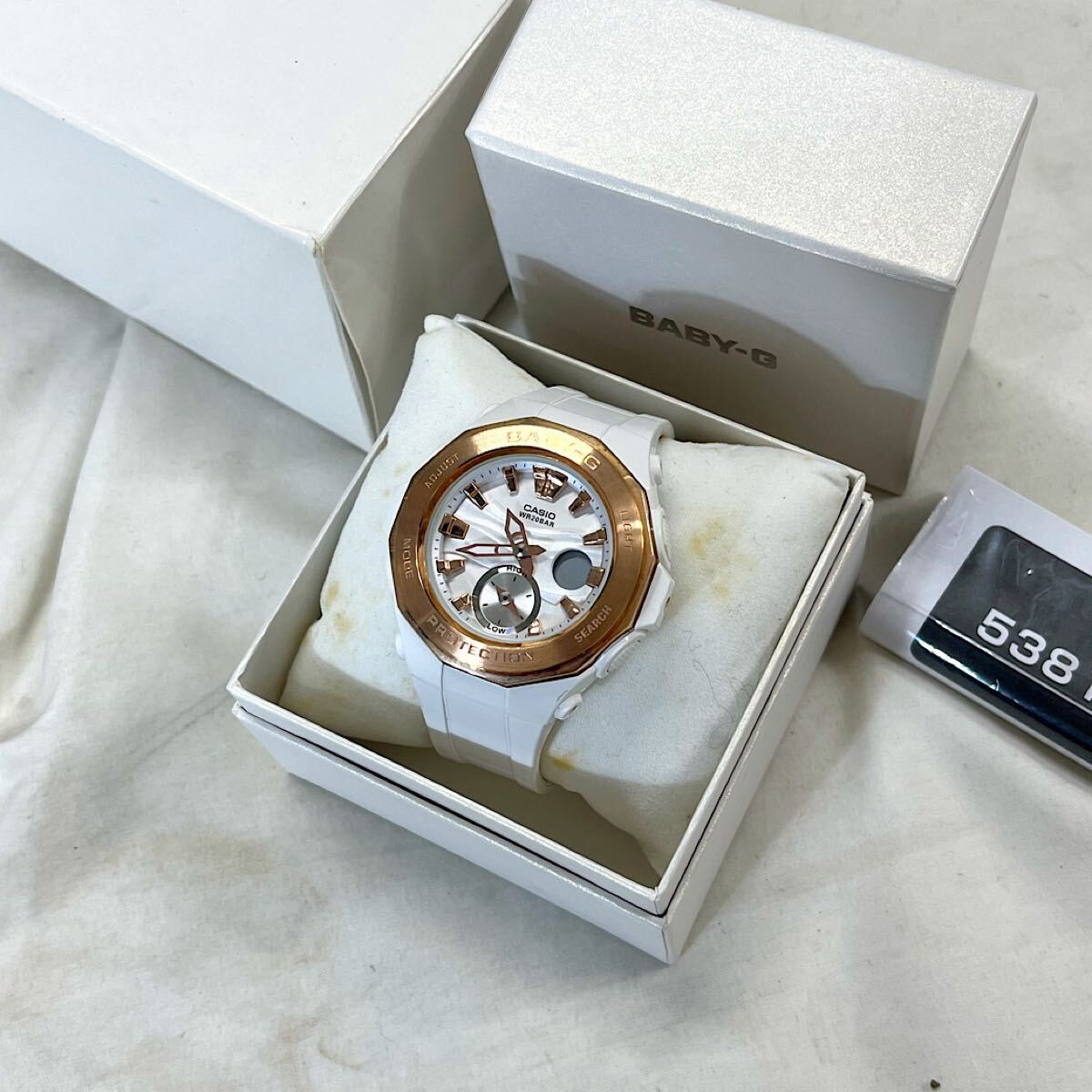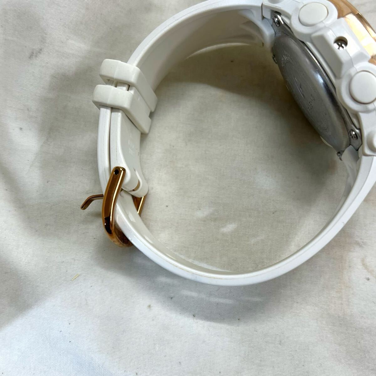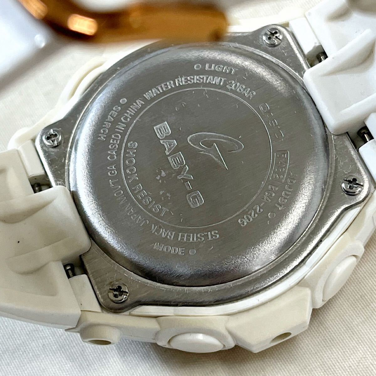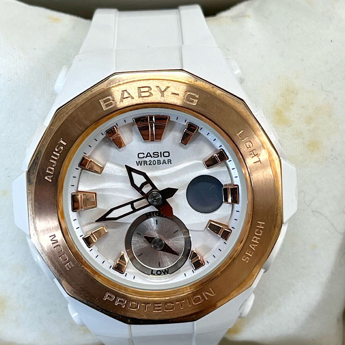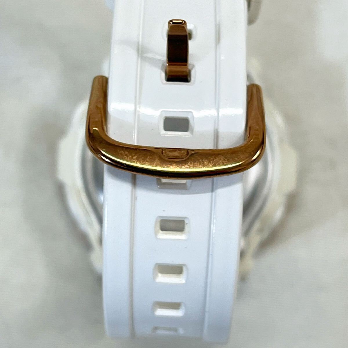 CASIOの人気シリーズ BABY-G(ベビージー) レディース腕時計、ホワイト×ローズゴールドカラーのアナログ+デジタルコンビモデルです。耐衝撃構造に加え、20気圧防水仕様でアウトドアやスポーツにも対応。上品なローズゴールドベゼルとホワイトバンドの組み合わせが女性らしい印象を与えます。