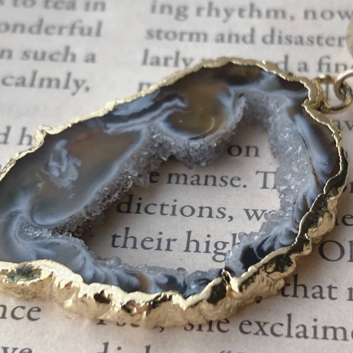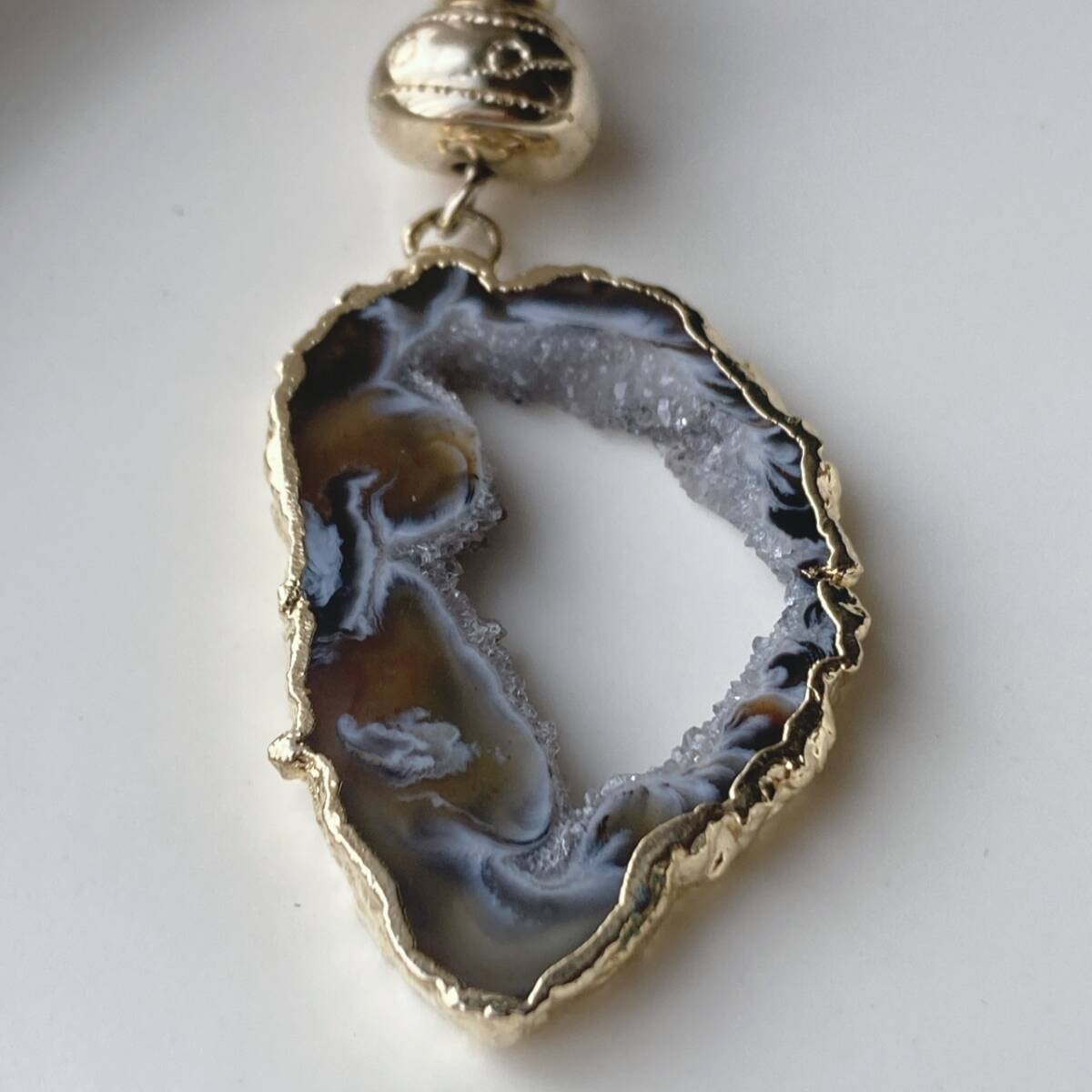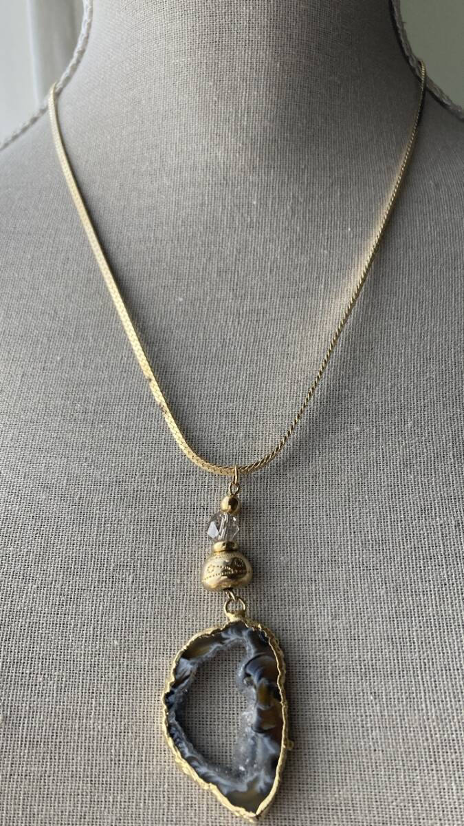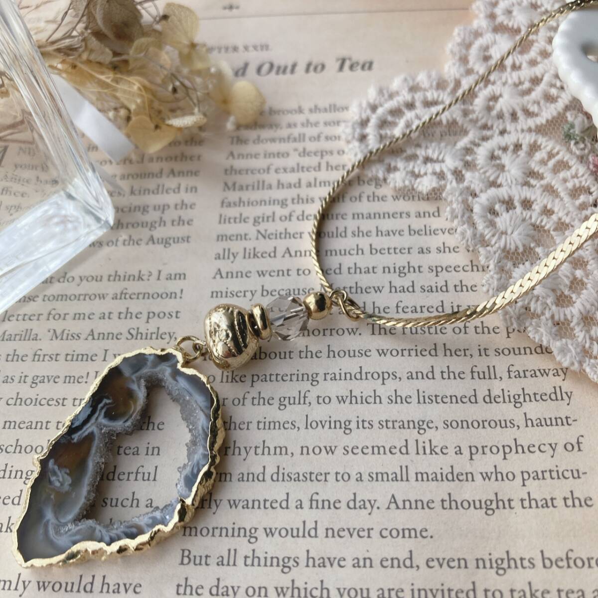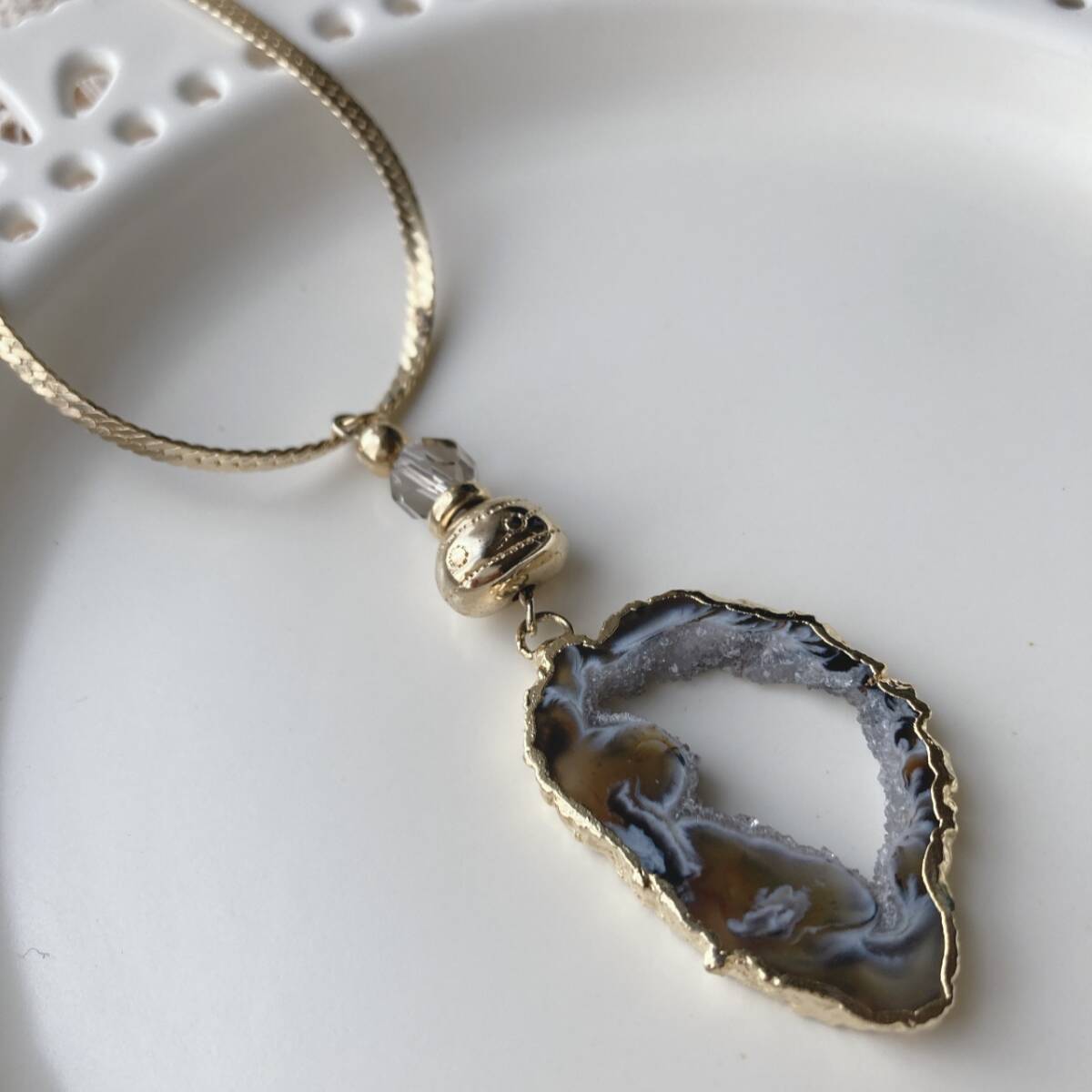 ヴィンテージネックレス 瑪瑙 不規則な半貴石 ペンダント グレー系 ゴールドトーン☆vintage jewelry accessories F0070