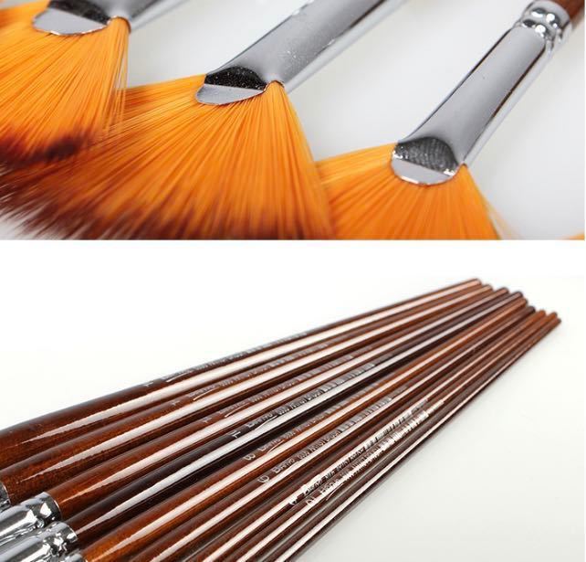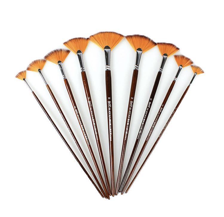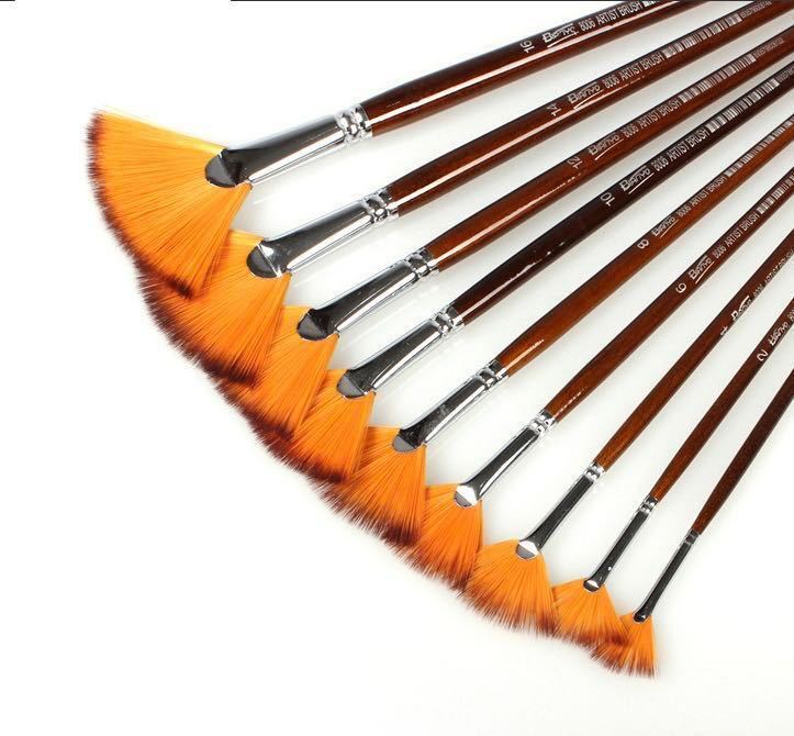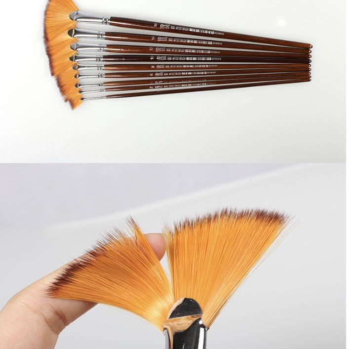 9種類の扇型筆シリーズ、油絵だけではなく、ペイント、アクリル画、水アクリル塗料、水彩、ガッシュペイント、顔ペイント、ボディーペイントのような塗料の作業に適用するアクリル筆。初心者から上級者までご利用いただけます。