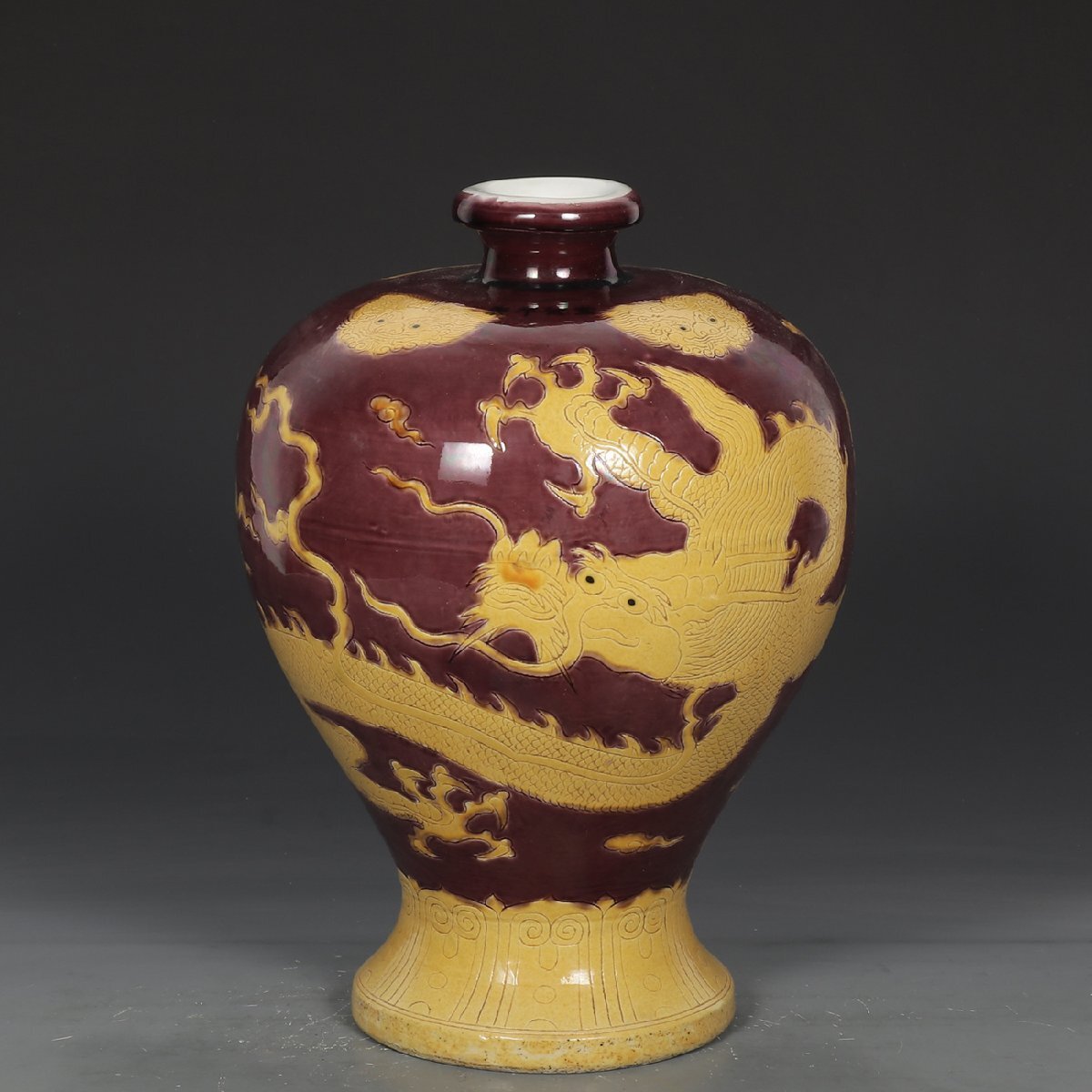 【安】明時代 大明宣徳年製 紫地黄彩龍紋梅瓶 共箱 唐瓷 染付 古陶瓷 中国古美術 古董品 192 サイズ(約寸) |