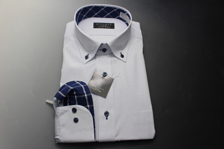 送料185円【新品】BIELMAN(山喜) ボタンダウン/ワイシャツ長袖 標準体 形態安定 M(39-82)  ブルー/ストライプ柄UND105/016-(7B160