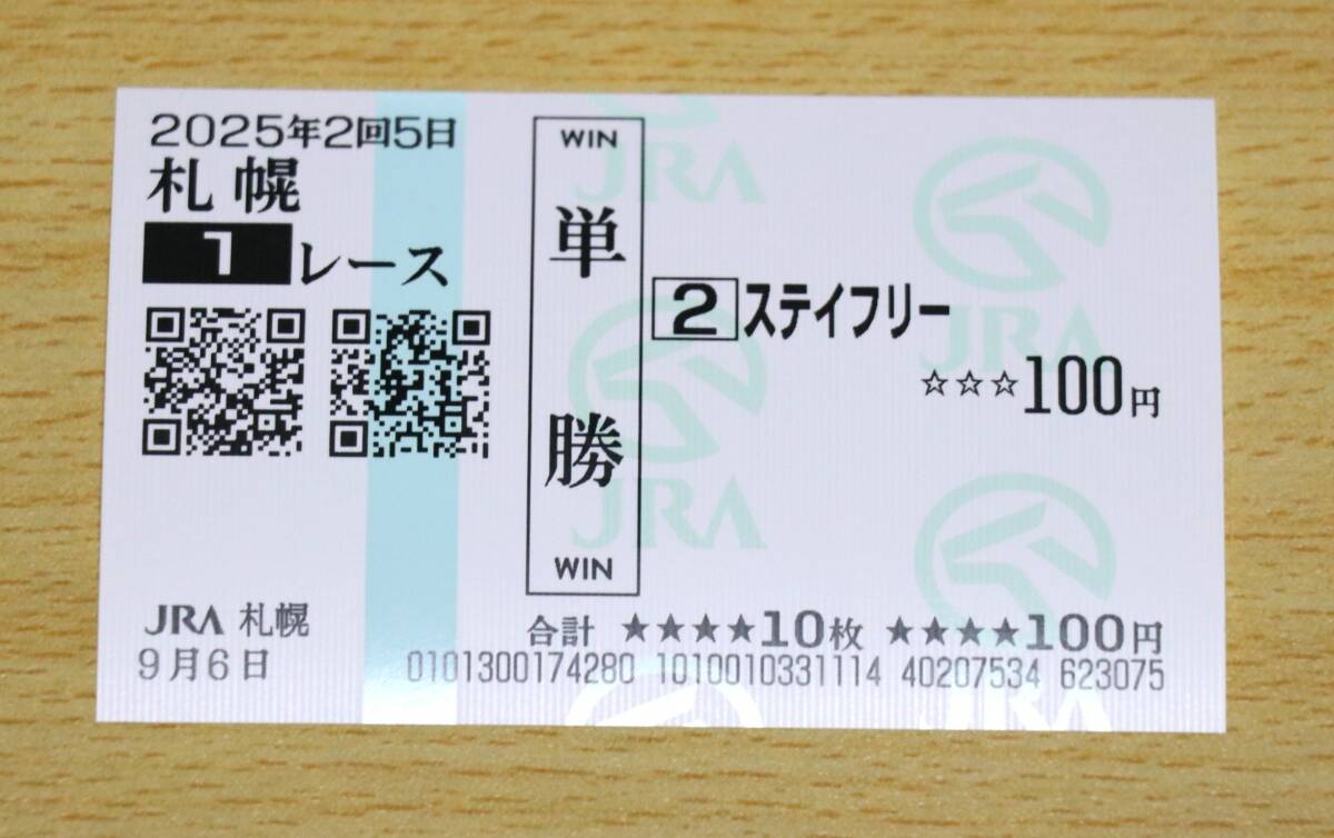 ステイフリー 札幌 1R (2025年9/6) 現地単勝馬券(札幌競馬場)です。気に入って頂けた方の落札を心よりお待ちしております。 商品は定型郵便(110円)又は又はゆうパケットポストminiで発送となります。 厚さの関係上、定型郵便の場合は片面段ボール補強、ゆうパケットポストの場合は両面段ボール補強となります。どうかよろしくお願い致します。