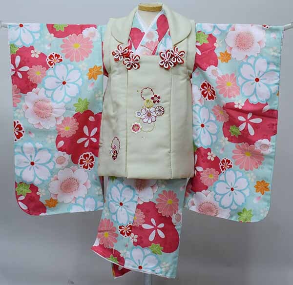 | 品質 | 仕立て上がり(すぐ着用できます。) ★華やかで鮮やかな色合いの祝い着です ★被布には美しい刺繍入り ★「伊達襟」が縫い付け済みです ★草履は鼻緒に可愛い小花の刺繍入りです ※表地、裏地、襦袢すべてポリエステル100% ※当店では、現物と写真画像の色、イメージに相違がないよう撮影に工夫を凝らしておりますが、 より詳しいお色説明をご希望のお客様は「サイト設置の質問」「メール(aji_net@khaki.plala.or.jp)」「お電話」「FAX」にて、御質問ください。 |