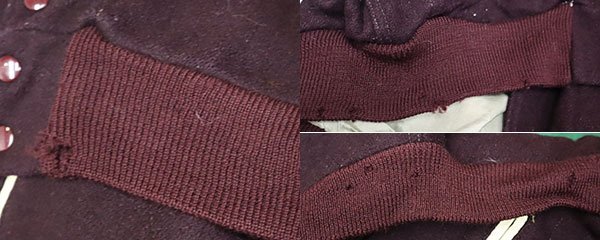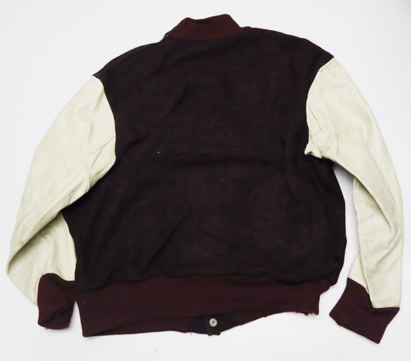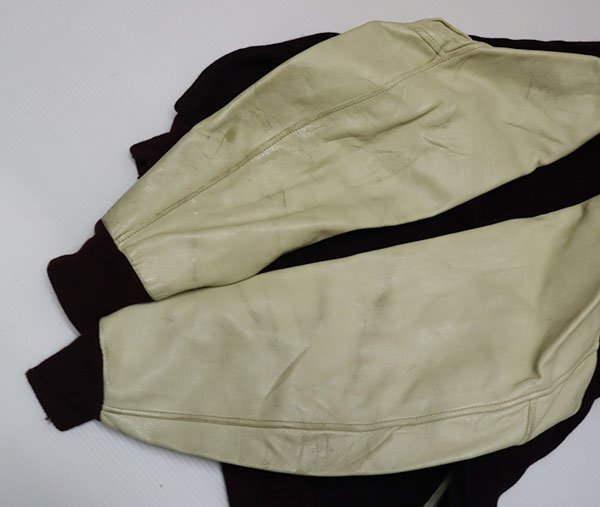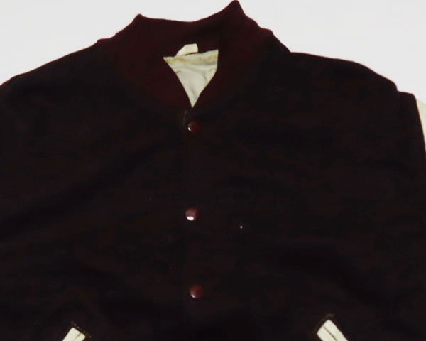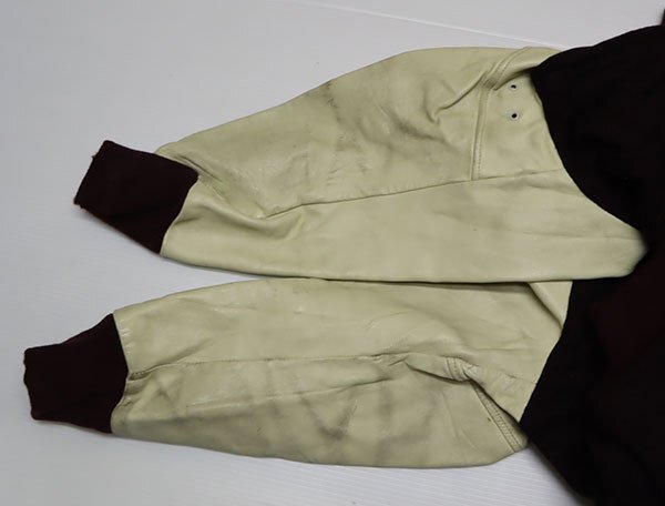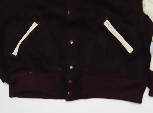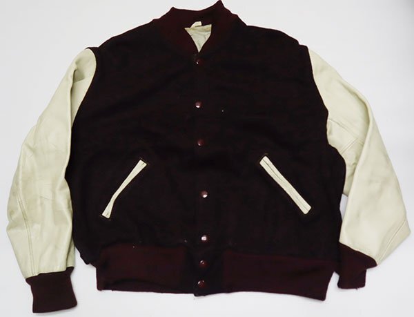 アメリカ買い付けの60-70年代頃のアメリカ製(表記はございませんが)の袖革&ポケット縁がレザーのスタジャンの小豆系X薄クリーム系で裏地はアセテートです。