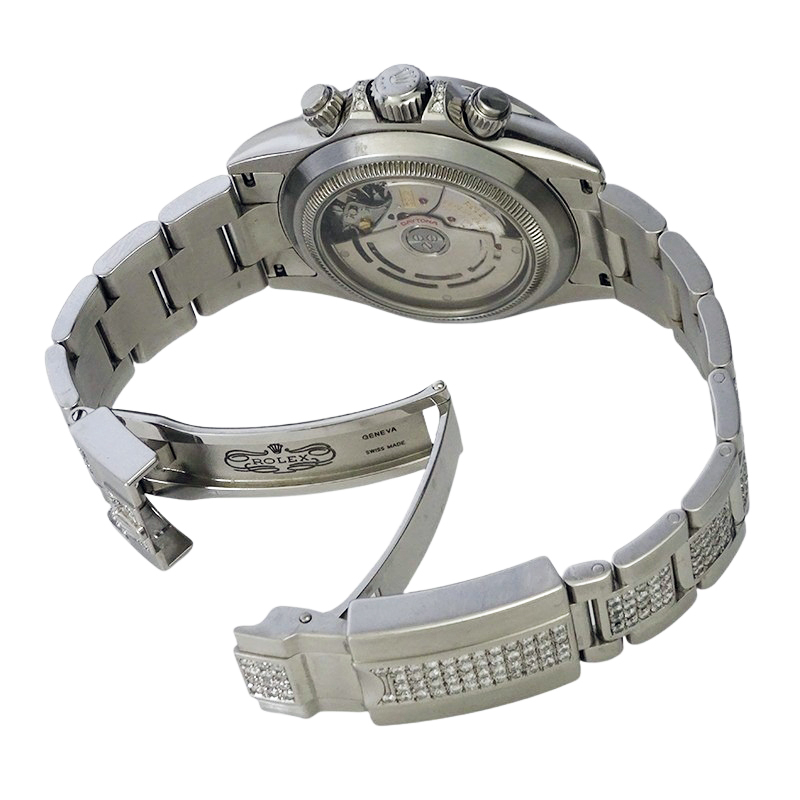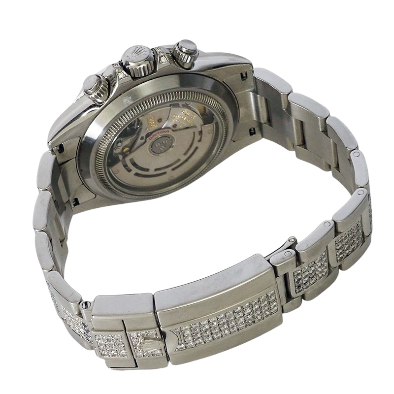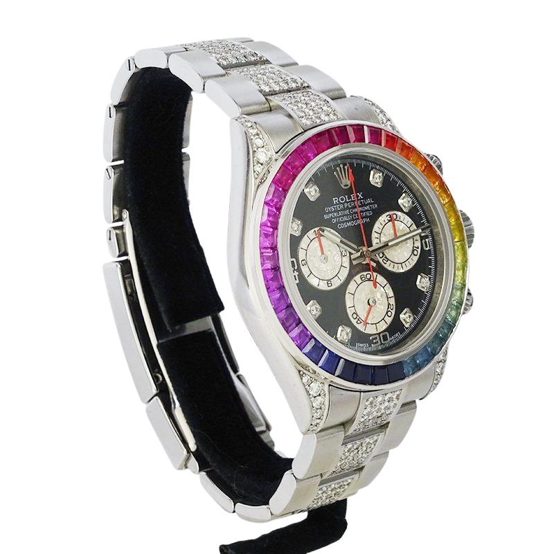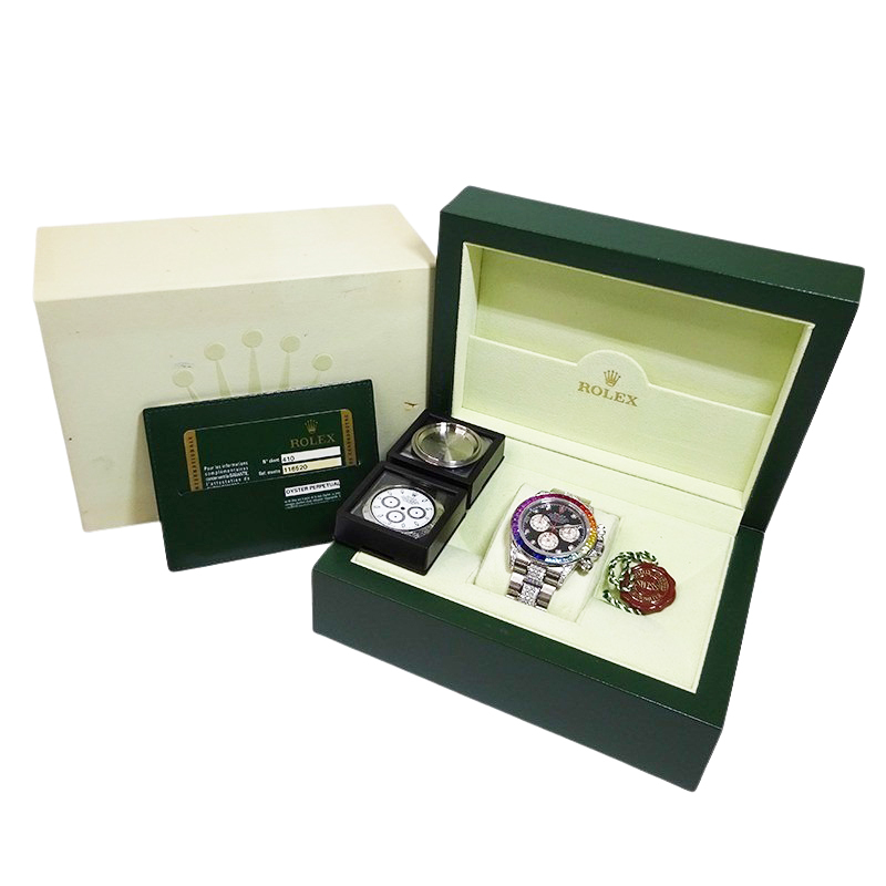【モデル】コスモグラフデイトナ レインボーカスタム 【型番】116520 【シリアル】V番(2009年製造) 【素材】ステンレススチール 【文字盤】ブラック文字盤/8Pダイヤインデックス 【ベゼル】レインボーカラーサファイアベゼル 【ムーブメント】自動巻き 【ケースサイズ】約40.0mm(ラグ・リューズ除く) 【腕回り】約17.0cm 【付属品】箱・保証書・純正ベゼル・文字盤・裏蓋・針 【コンディション】中古 【商品ID】FL-KD-38 【商品詳細】 ケース・ブレスに細かな小傷が見受けられますが、目立つ大きな傷などはないコンディションです。 風防は、目立つ大きな傷などはなく視認性に問題ありません。 【おすすめポイント】 116520デイトナがベースのカスタムモデル ・ブラック文字盤(社外品) ・116598RBOW用レインボーベゼル(社外品) ロレックスの時計の中で最高峰の人気を誇る「デイトナ」116520を希少価値の高い116599RBOW仕様にカスタムしたモデルです。 ロレックスでの正規サービスを受けることは出来ませんが、弊社でOH・修理等のメンテナンスを承っております。 |