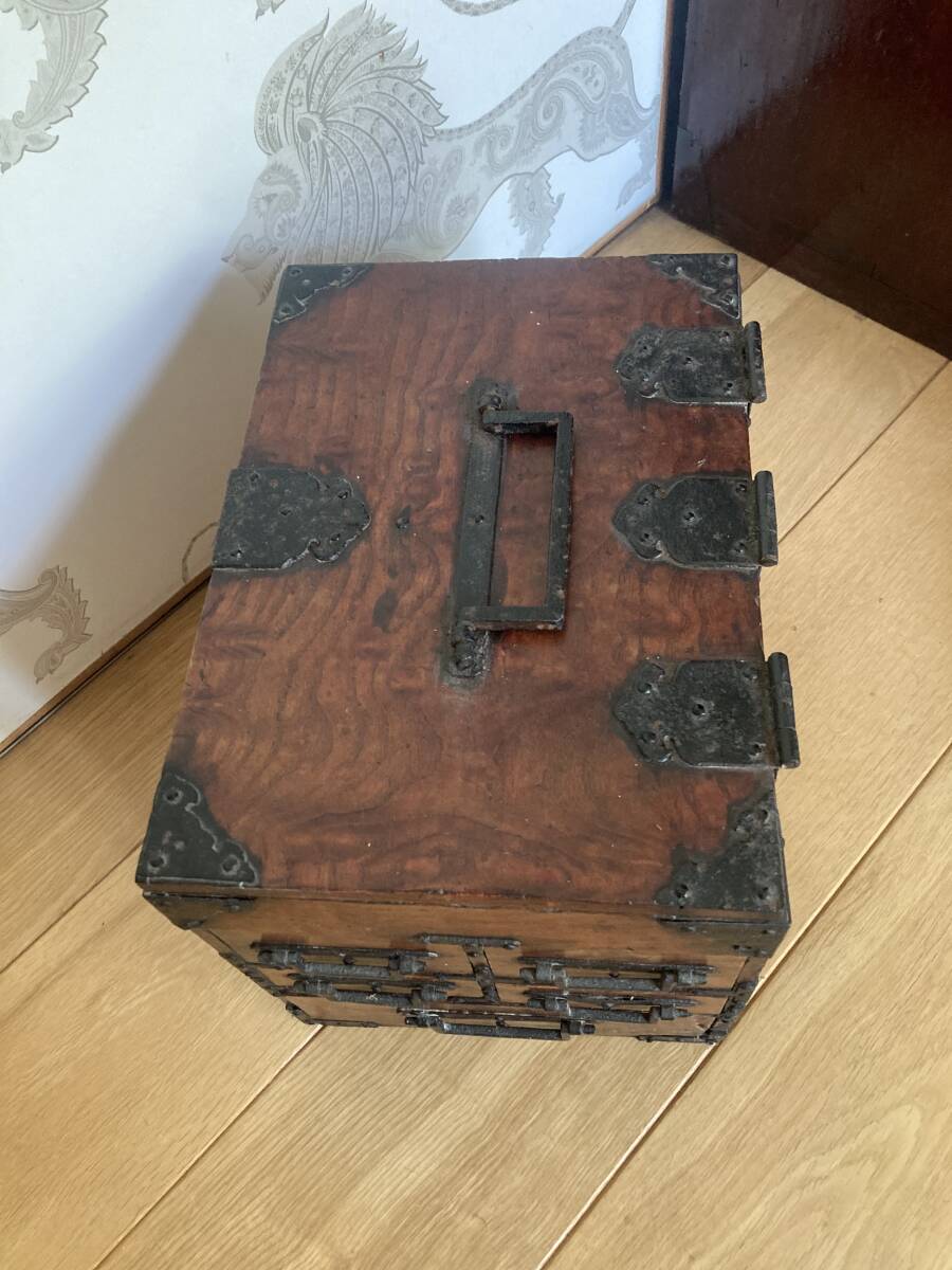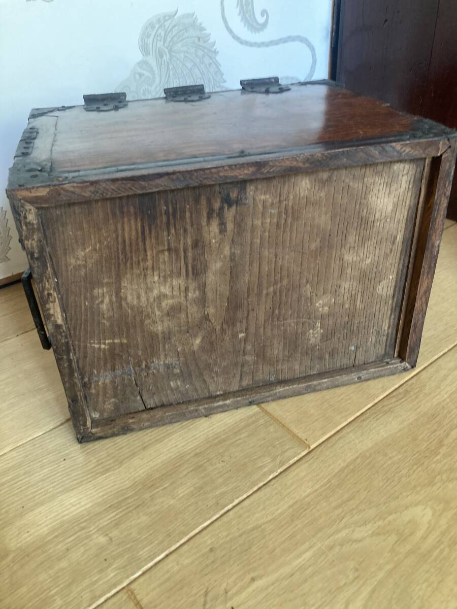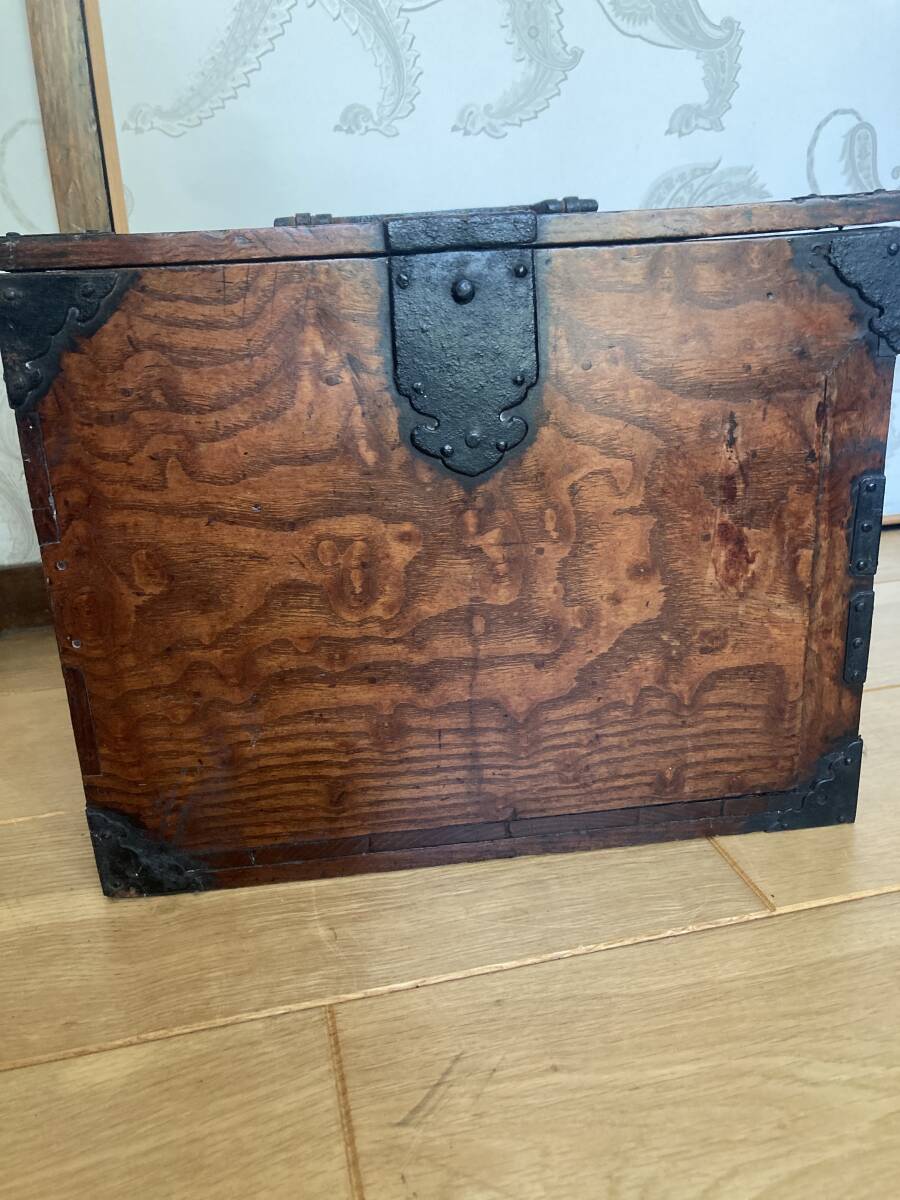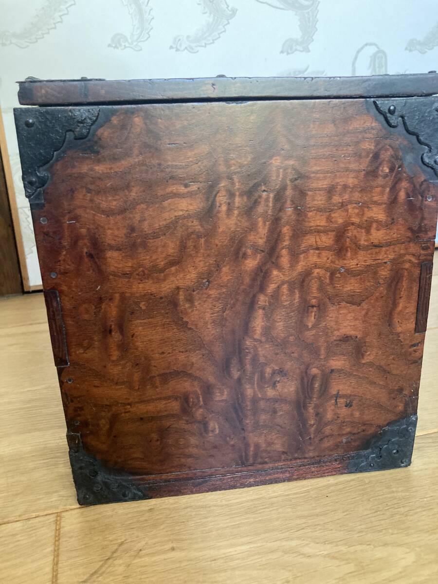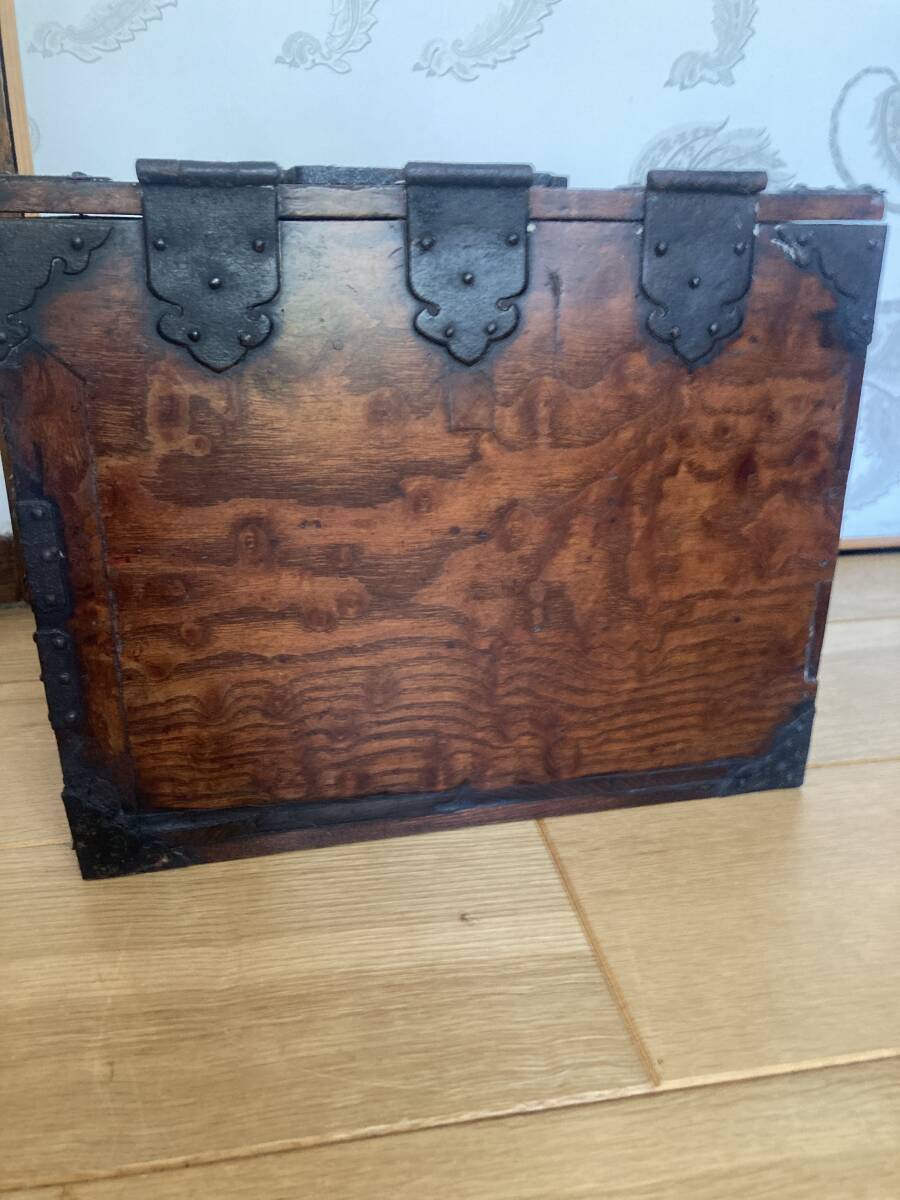 江戸後期から明治時代くらいの欅の杢玉の出た素晴らしい掛け硯です。同時代の船箪笥は金庫ですが、掛け硯は書道用の道具です。時代なりの劣化もありますが、全体が硬い欅で出来ており、ソリなどは全くありませんし、金具もすべて制作当時のままでしっかり付いています。