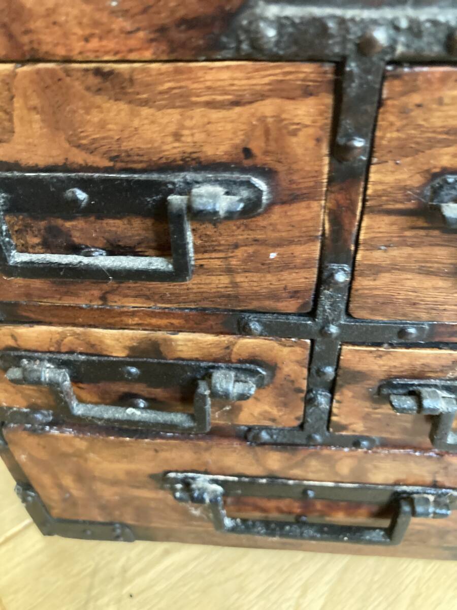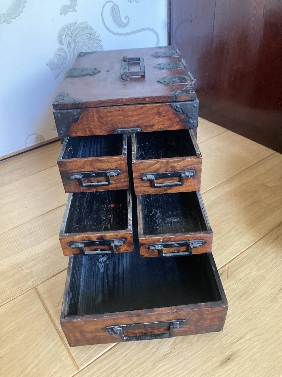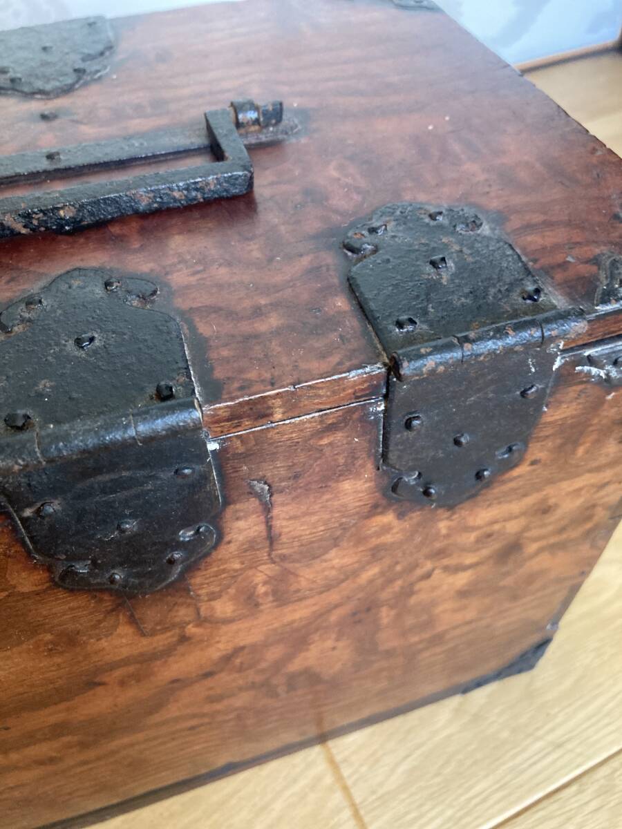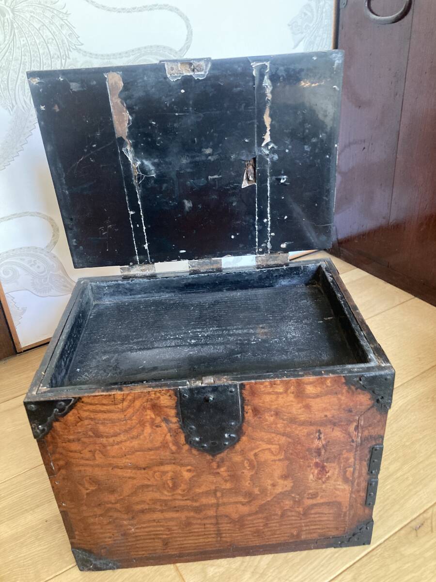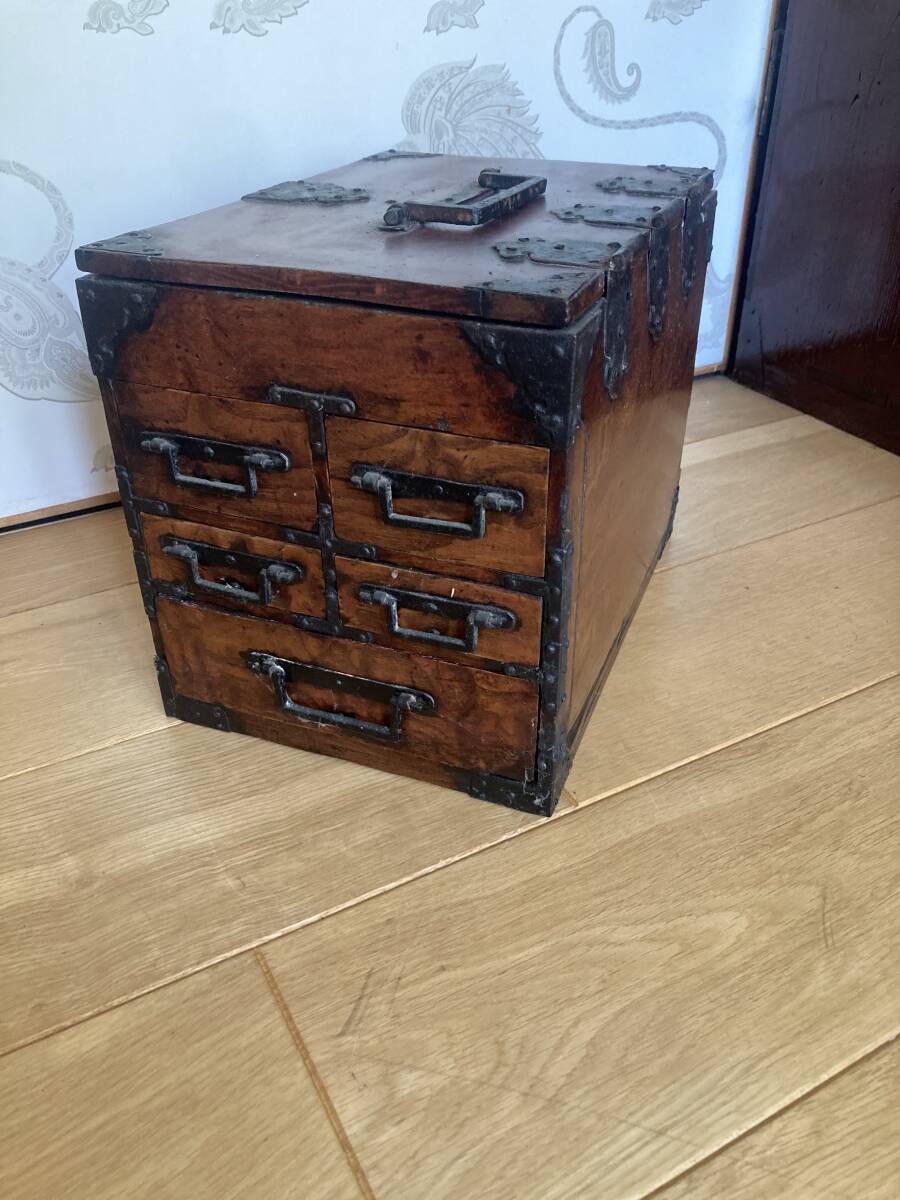 江戸後期から明治時代くらいの欅の杢玉の出た素晴らしい掛け硯です。同時代の船箪笥は金庫ですが、掛け硯は書道用の道具です。時代なりの劣化もありますが、全体が硬い欅で出来ており、ソリなどは全くありませんし、金具もすべて制作当時のままでしっかり付いています。