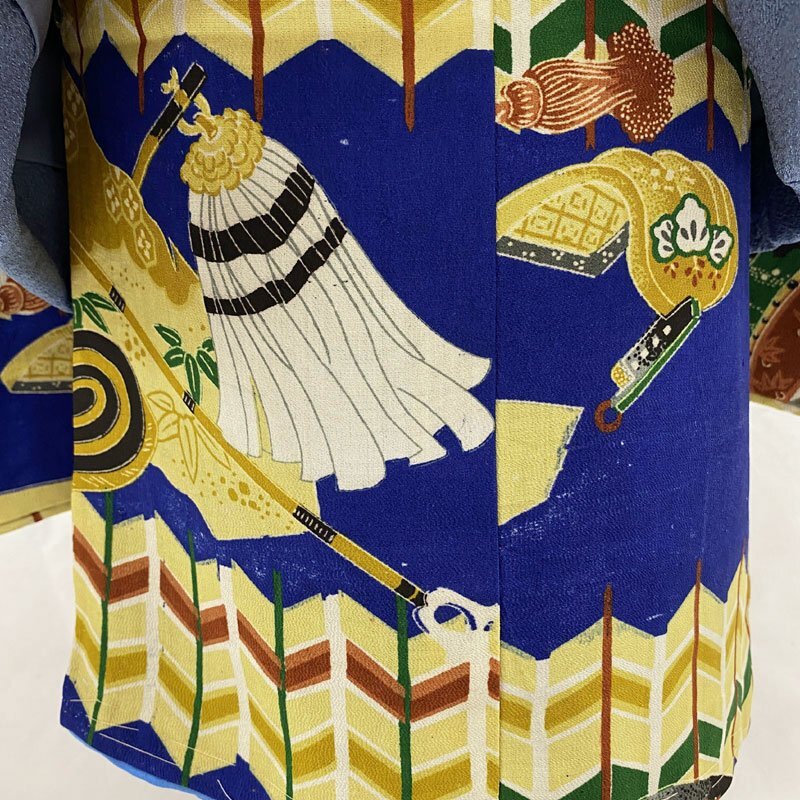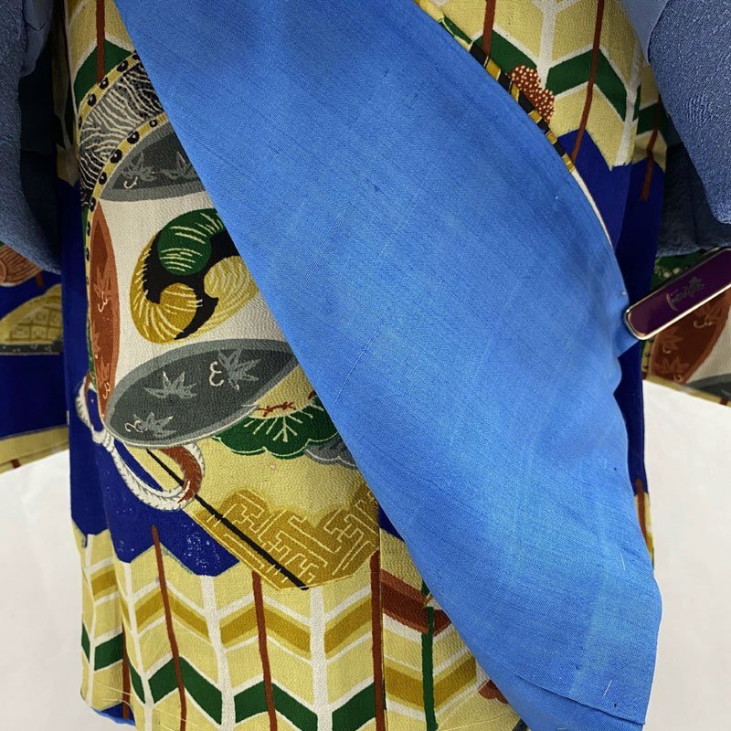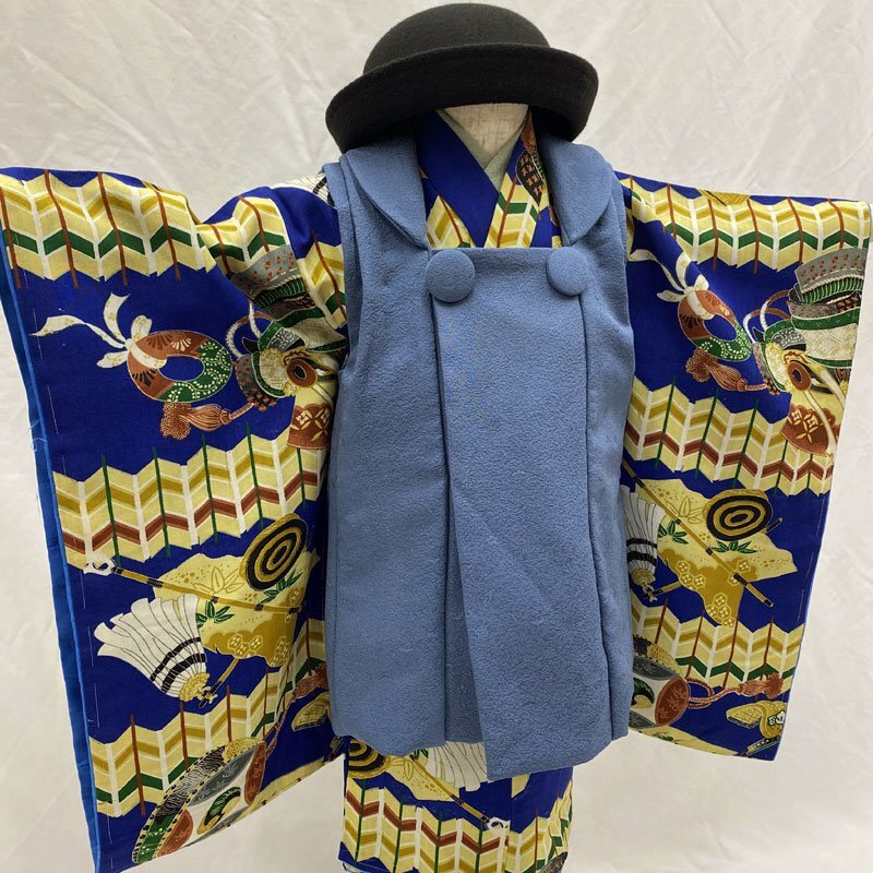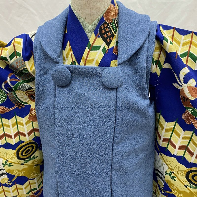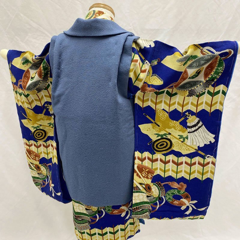 ◎七五三 三歳 男の子 アンティーク着物&被布 レトロ 紺青◎ (No.id) こちらの商品は着物、被布です。その他の帽子、楽々衿、半衿、ブーツはセットに含まれません。 人気のアンティーク着物にハンドメイドの被布を合わせました。 紺青色の地に、兜、弓などの文様がある七五三3歳のアンティークのお着物です。お宮参りの掛け着から使用可能で、3歳七五三まで、体系によっては袴を合わせて5歳の七五三まで長くご使用いただけます。 (着物)一つ身です。画像以外にも染ムラのようなもの、糸のつれがところどころにございますが、被布で隠れる部分もございます。内側八掛に薄い汚れがございますが、内側なので見えません。アンティークの中では状態が良いです。3歳のお着物として使用する際は、肩上げをしておりませんので、お子様の裄丈に合わせてお直しをお願いします。 (長襦袢)こちらには長襦袢が付属いたしません。3歳の七五三で使用する場合は、長襦袢の代わりにお子様の負担が少なく便利な「子ども用楽々衿」をお勧めします。#ag楽々衿 (被布)着なくなった中古品の正絹着物をリメイクしたハンドメイド品です。ハンドメイド品ですので、完璧を求める方はご遠慮ください。 【表地素材】(着物)正絹、(被布)正絹 【色】紺青 *モニターによって色味は実際と異なる場合がございます。 【サイズ】(着物) 裄:41.4cm、肩上げ幅:-cm、袖幅:24.8cm、袖丈:56.5cm、丈(肩から):95.5cm、腰上げ幅:-cm、前幅:13.9cm、後幅:16.5cm (被布) 幅:39cm、丈(肩から):49cm *素人採寸のため、多少の誤差はご容赦ください。 アンティーク着物で古い物ですので、それなりのシミや汚れ、ほつれなどダメージ等あるかと思います。現在出回っているアンティーク着物はシミやアクなどのダメージや手直しなど難がある事の方が多いです。多少の目立たないシミやアクに関しては記載をしておりませんので、ご了承ください。新品同様の綺麗さをご希望の方、少しのシミやアク、ほつれなどアンティークに御理解頂けない方のご購入はお控えいただきますよう、お願いします。 |