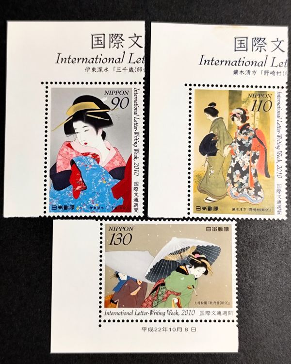[25090435]【国際文通週間 2010年】単片3種完 角「伊東深水 三千歳・鏑木清方 野崎村・上村松園 牡丹雪」90+110+130円 美品