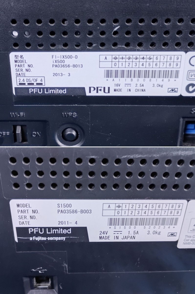 「S1500」通電のみ確認済み、「iX500」通電動作未確認です。どちらもスキャン(読み取り)を含む、詳細な機能の動作確認は出来ておりません。 使用に伴う若干の擦れ傷や汚れなどございます。
