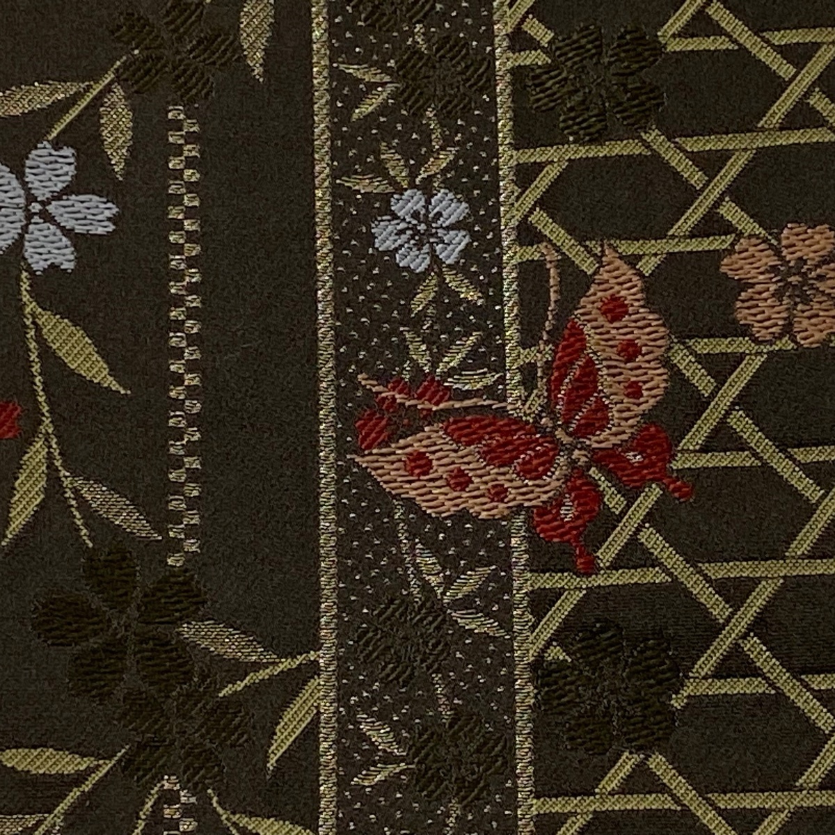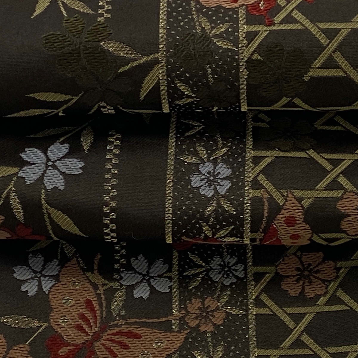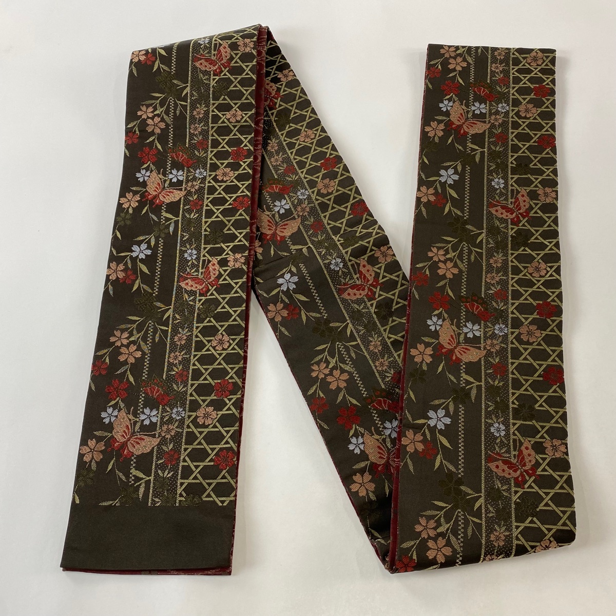 半幅帯 優品 枝垂れ桜 蝶 箔 焦茶色 化繊 【中古】 |