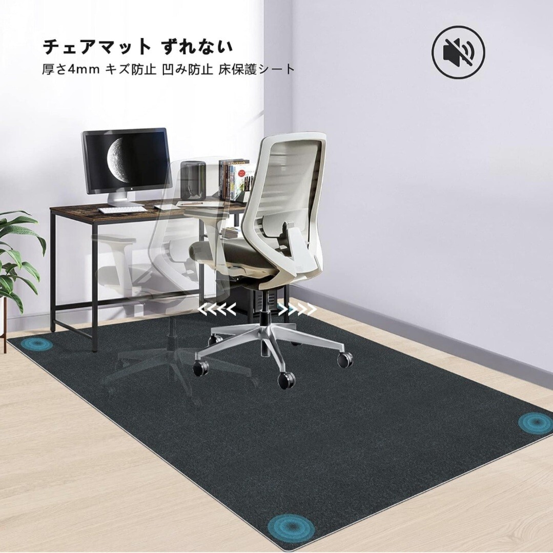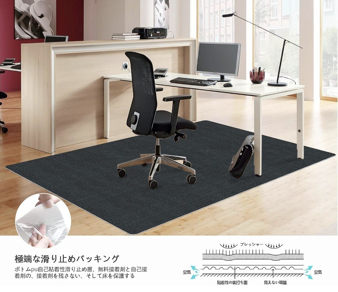 マットに座った時の荷重により、床に傷がついたり、床がくぼんだりするのを防ぎます。粘着性も有り、厚さは4mmで椅子が動くときのノイズを軽減します。