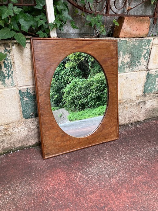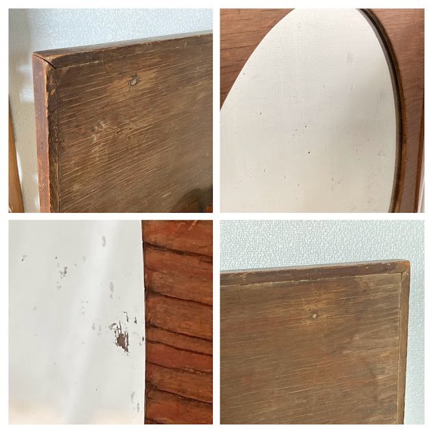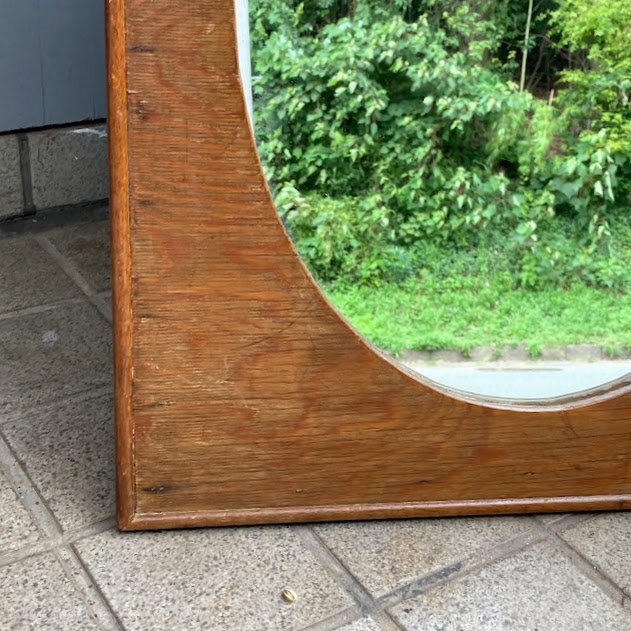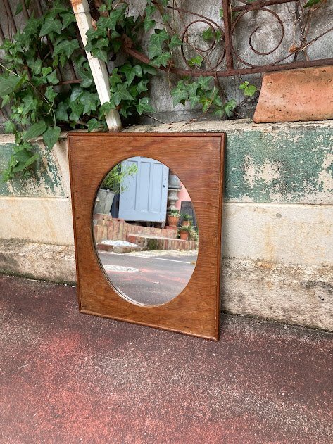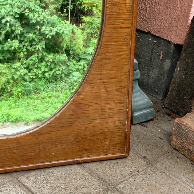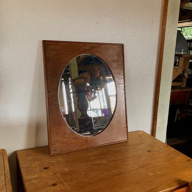 艶やかなオールドパインのフレームに楕円形の鏡を施した鏡が入荷しました。イギリス製、推定1940年代。後ろのチェーンを固定する部分は新しい物と交換されていました。幅45㎝ほどのサイズ感ですので、どんな場所にも設置できそうですね。古いオリジナルの鏡ですので、アンティークらしい黒く見える部分が見られます。長い時間を経た証として、お楽しみいただければ幸いです。机の前に立てかけたり、洗面台や玄関鏡としてもいいですね。ナチュラルな空間がお好きな方におすすめ。福岡市南区の店舗にてお渡しもできますのでお気軽にどうぞ!