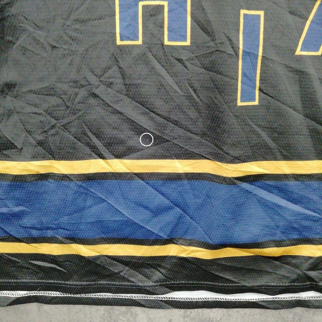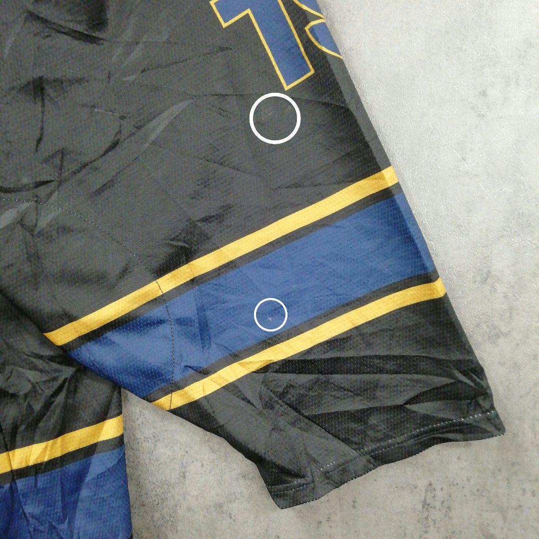 右腕の番号『19』近くに光沢のある擦れた黒い汚れと右袖口に近 い、ネイビーカラーのライン上に白っぽくなったほつれが多数あります。